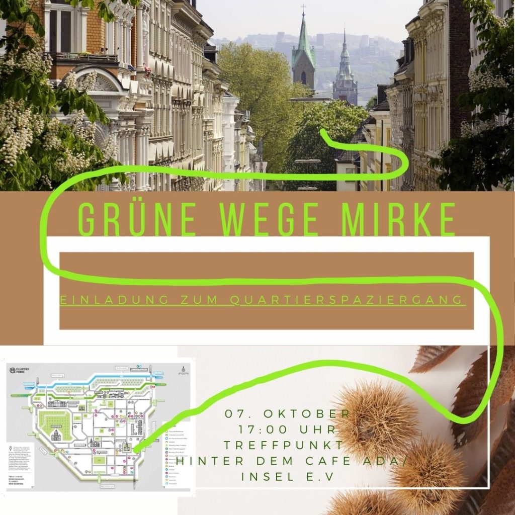Wir laden zum 3. Quartiersspaziergang ein und erkunden und entdecken gemeinsam die grünen Inseln des Quartiers und seine Verbindungen. Gemeinsam wollen wir so unser Augenmerk auf die Grünflächen des Quartiers lenken. Wir treffen uns um 17.00 Uhr im Garten hinter dem Café Ada und spazieren zusammen los.