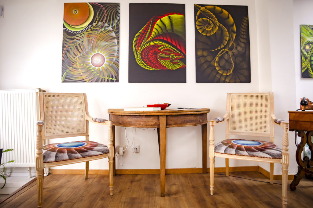 Haare schneiden und Malen? Das klingt erstmal nach einer eigentümlichen Kombination. Doch nicht nur die räumliche Kombination aus Salon und Atelier, sondern auch die kreative Nähe sind für Alfonso selbstverständlich. Am Anfang seiner Malerei war die Kugel. Er malte Kugeln über Kugeln über Kugeln, um sich ihrer Vollkommenheit zu verschreiben. Nachdem er diese meisterte, hörte er auf zu malen – Aufgabe erledigt. Erst die Nachricht von der zukünftigen Geburt seiner Zwillinge 2018 inspirierte ihn wieder zum Stift zu greifen. Eine darauf folgende schlaflose Nacht voller Freude setzte einen neuen Anfangspunkt in Alfonsos Geschichte. Seitdem malt er ununterbrochen diffuse, organische und farbenfrohe Landschaften, Formen und selbstverständlich Kugeln. Malen und Haare schneiden lassen sich in Alfonsos Kopf damit nicht von einander trennen. In einem vernetzten Miteinander existieren diese Sphären in seinem Ladenlokal gleichzeitig und nebeneinander. Alfonso selbst sieht das als essentiellen Punkt in seinem Leben. Er möchte nicht bloß dem monetären Reichtum nachhaschen, sondern sein Leben selbstbestimmt und kreativ leben. In diesem Sinne versteht er sein Ladenlokal und die Erfolgsgeschichte, die dahinter steht, implizit auch als Anreiz für eine fortschreitende Belebung der Friedrichstraße. Es braucht immer jemensch, der einen ersten Schritt wagt und zeigt, dass es funktionieren kann – Alfonso ist einer von diesen Menschen.