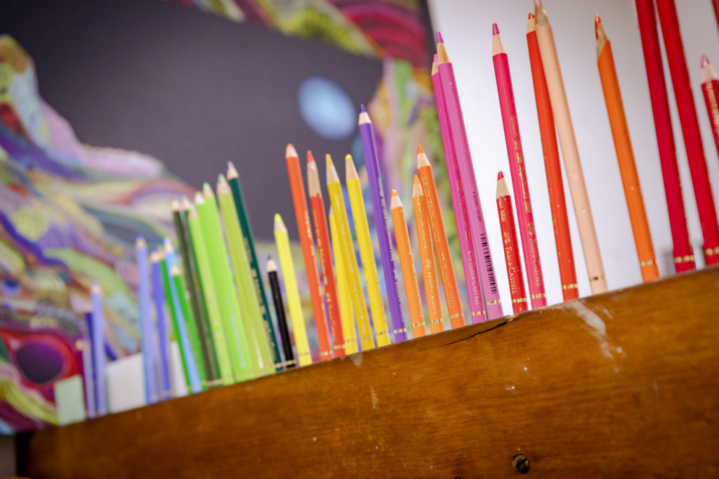 Wir betreten das Ladenlokal. Was auf den ersten Blick klar wird: Das hier ist kein gewöhnlicher Friseursalon. Statt Unmengen an Werbung für Haarprodukte oder Bilder von frisch frisierten Menschen, sind die Wände des unscheinbaren Ladenlokals mit bunten Bildern übersäht. Sie zeigen skurrile, aber organische bunte Formen und Verläufe und lassen den Raum wie eine Galerie wirken. Im hinteren Teil des Raumes stehen drei bodentiefe Spiegel, davor je ein schwer anmutender, aber bequemer Drehstuhl. Ein Blick um die Ecke offenbart das Herzstück des Salons: eine mit Mosaiksteinen übersäte Theke und das dahinter liegende Atelier. Darin ragen zahlreiche Buntstifte der Decke entgegen, als würden sie nur so darauf warten ihrem Zweck zugeführt zu werden. An der Theke treffen wir auf Alfonso, der uns herzlich begrüßt und auf einen Espresso einlädt. Wie kommt er zu solch einem Laden? Alfonso verließ Wuppertal auf Grund einer Beziehung für rund zwei Jahre. Doch letztendlich zog es ihn zurück in seine Heimat und hier angekommen eröffnete er seinen eigenen Salon, zog um, nur um wieder umzuziehen. Am Ende seiner bisherigen Odyssee gelangte er über einen Freund an das Ladengeschäft in der Friedrichstraße 10, nur wenige Gehminuten von der Wohnung entfernt, in der er 1977 sein Leben in Deutschland begann. Alfonsos Geschichte handelt demnach nicht bloß von dem Finden eines Raumes, in dem er sich selbst verwirklichen kann, sondern auch von einer Art der Rückkehr zu sich selbst und den Orten, die ihn definieren. Er zog selbstverständlich ein und setzte damit einen Impuls auf der Friedrichstraße, der in den letzten Jahrzehnten dringend notwendig geworden war. Seitdem schreibt Alfsonso seine ganze eigene Geschichte im Quartier, die von dem Gefühl der verbundenen Nachbarschaft ebenso geprägt ist wie von dem Willen mehr zu wollen.