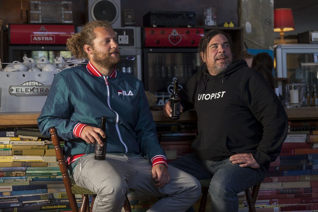 Um diese Fragen zu klären wage ich mich in die Tiefen von Utopiastadt. An einem Freitagnachmittag treffe ich mich mit zwei Utopist*innen. Ich betrete die Schalterhalle des ehemaligen Bahnhof Mirke, das heutige Café Hutmacher. Die Gastronomie gilt als Eingangstor zu Utopiastadt. An warmen Sommertagen ein Anlaufpunkt für hunderte Wuppertaler*innen jeden Alters, die es sich auf dem ehemaligen Bahnsteig, direkt an der Nordbahntrasse gemütlich machen und das Leben bei einem Getränk aus der Region genießen, während die Boombox das Ganze musikalisch begleitet. In den denkmalgeschützten Räumlichkeiten des Hutmachers scheint die Zeit still zu stehen. Die unverputzten Wände, die Weinregale aus alten Bienenkästen, die alten Lampenschirme und die Kacheln auf dem Boden sprühen vor liebenswertem Charme, der insbesondere in den Abendstunden zum Vorschein kommt. In gemütlicher Runde wird bei einem Kakao und einem Stück Kuchen das Brettspiel ausgepackt, es wird gelacht und geredet. Der Name des Lokals ist an eine Figur aus Lewis Carolls 1865 erschienenem Kinderbuch »Alices Abenteuer im Wunderland« angelehnt. Dort trifft Alice bei einer Teegesellschaft auf den etwas verrückten Hutmacher der gemeinsam mit ihr und dem Märzhasen ihren Nicht-Geburtstag feiert. Ein Synonym das den Hutmacher ausfüllt. Die liebevoll aufgestapelte und einzige Büchertheke in der Talstadt dient den Utopist*innen als Ort des Austauschs. Hier entstehen Ideen, gelebte Utopien und Gesellschaft. Kein Wunder, dass ich Johannes Schmidt und Niklas Brandau an der Theke sitzend antreffe. Jazzmusik ertönt im Hintergrund und nach einer kurzen Begrüßung nehmen wir gemeinsam auf dem zusammengewürfelten Mobiliar Platz.