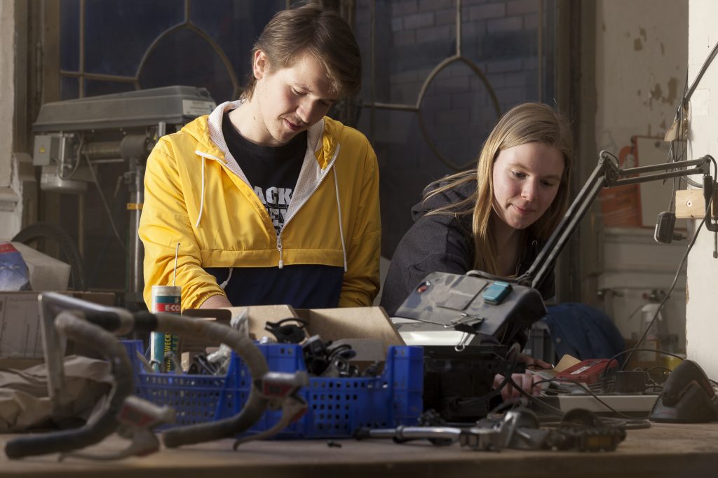 Niklas und Johannes führen mich weiter in die so genannte UtopiastadtWerkstadt. Wir treffen auf die Bundesfreiwilligendienst Leistenden Leonie Sonntag (20) und Tobias Kaminski (19). Die Zwei sind für ein Jahr fest in Utopiastadt angestellt und kümmern sich neben der Entwicklung von sozialen Projekten mit Jugendlichen um die alltäglichen Aufgaben die in Utopiastadt anfallen. Zwischen dem Aufbau von Konzerten, Vermietungen, und der Planung von eigenen zukünftigen Projekten, sind sie ab und zu auch in der Werkstatt anzutreffen. Hier findet außerdem das Reparatur- und Schraubercafé statt, an dem Wuppertaler*innen ihre Elektrogeräte und Fahrräder mitbringen, um sie gemeinsam unter fachlicher Anleitung zu reparieren. Außerdem gibt es nach einer Werkstatt-Einführung die Möglichkeit sich am Lasercutter, A0-Plotter sowie am 3D-Drucker auszuprobieren. Die UtopiastadtWerkstadt ist aber vor allem Treffpunkt und Ort der Umsetzung. Hier werden Projektideen angegangen und im kreativen Austausch entwickelt. Es wird gewerkelt, geschraubt und geplaudert. Das sieht man diesem Ort auch an.