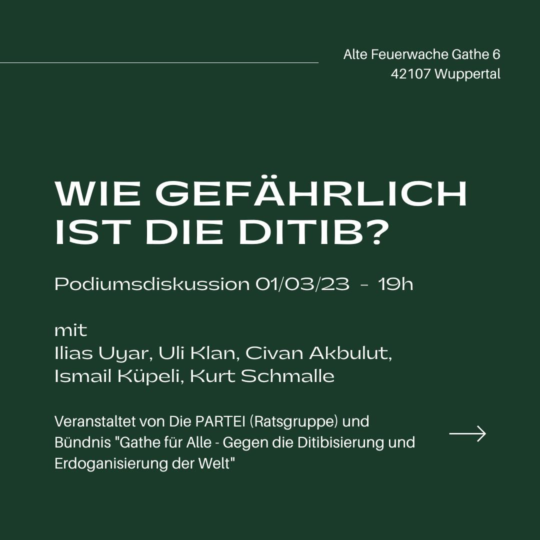 1. März 2023 19:00 Uhr Alte Feuerwache Wagenhalle, Gathe 6, 42107 Wuppertal Veranstalter:innen: Die PARTEI Ratsgruppe Wuppertal und Bündnis „Gathe für alle! Gegen die #DITIBisierung und ErdoÄŸanisierung der Welt“ Es diskutieren: Ilias Uyar (Köln), Rechtsanwalt, Initiative Völkermord erinnern!Uli Klan (Wuppertal), Armin T. Wegner GesellschaftCivan Akbulut (Essen), Die Linke Essen, Mitglied im Integrationsrat EssenDr. Ismail Küpeli (Duisburg), forscht zu Nationalismus, […]