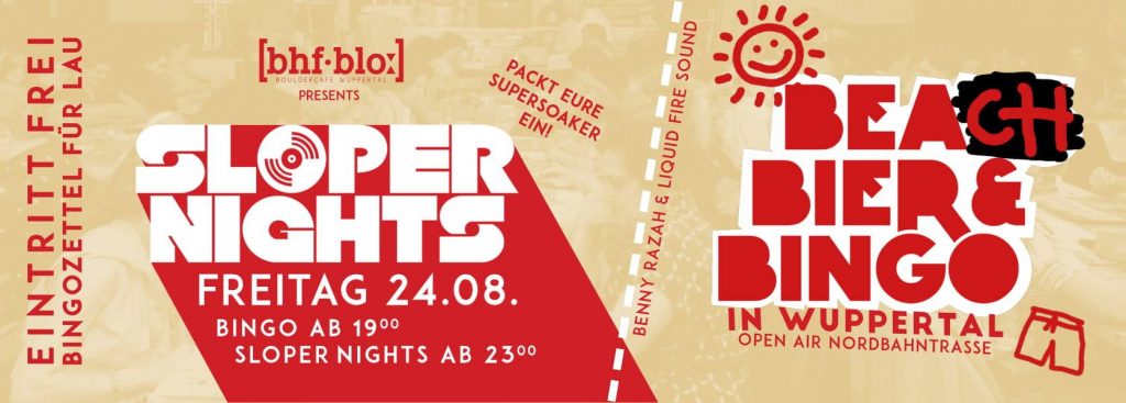 Nach 4 überwältigenden Beats, Bier & Bingo-Veranstaltungen in Wuppertal, freuen wir uns mega euch ein 5. Mal begrüßen zu dürfen. Dieses mal in Kombination mit Slopernights im wundervollen Bahnhof Blo, Open Air!