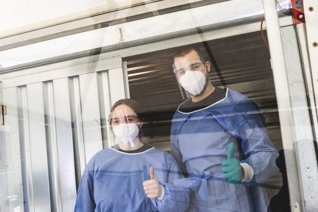 Die Existenz des Testzentrums hat aber nicht nur Auswirkungen auf die vielen Wuppertaler*innen die sich hier testen lassen. Auch den Utopist*innen wird damit die Möglichkeit eröffnet, und ehrenamtliche Arbeit in Zeiten der Pandemie sicherer gemacht. Das ermöglicht ein wöchentliches internes Sanierungs-Workout mit gutem Gefühl, ersetzt Abstand und Maske jedoch nicht. Johannes ist es allerdings auch wichtig, dass Utopiastadt mit dem Testzentrum ein Zeichen sendet. Die Pandemie nach eigenen Möglichkeiten zu bekämpfen und somit einem Beitrag zum Gemeinwohl beizutragen ist utopischer, als die Türen zu schließen und abzuwarten bis alles vorbei ist – vorausgesetzt es gäbe Utopiastadt unter diesen schwierigen finanziellen und sozialen Bedingungen dann noch. Apropos Existenzen: Die Mitarbeiter*innen des Testzentrums wurden in ihrem herkömmlichen Arbeitsleben allesamt von den Auswirkungen der Pandemie eingeschränkt. Hier arbeiten Musiker*innen, neben Student*innen und Tontechniker*innen. Die Arbeit im Testzentrum ermöglicht es ihnen finanzielle Mittel zu sichern und somit auch in Zukunft ein Dach über den Kopf zu haben.