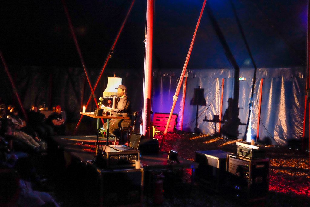 Das Zelt selbst erstrahlt während der Eröffnung in einem surreal-magischen Licht. Neben dem etwas strengen Geruch, der dem kurz zuvor verstreutem Holzhackschnitt zu verdanken ist, erstrahlt besonders der Himmel des Zeltes. Das blau-lila-rot illuminierte Zelt samt seiner tragenden Streben erschafft einen gemütlich anmutenden, zu gleich jedoch industriellen Charme. Die Bühne ist ganz im „Hutmacherstil“ gehalten. Alt-Oma Lampe, handgeknüpfter Teppich, ein altes Schulpult und der ikonische Zylinder umgeben Salmen. Das Mobiliar auf dem die Gäste platz nehmen ist, wie auch anders zu erwarten, wild zusammengewürfelt und auch die Palettentheke spiegelt den Stil der Utopist*innen wieder. Hier wird selbstgemacht, angepackt, Spaß gehabt und dank vieler Erfahrung hochwertiges Kulturprogramm erschaffen. Außerdem haben die Utopist*innen durch diesen Abend laut eigener Aussage so einiges gelernt. So werden sie sich in Zukunft um eine verbesserte infrastrukturelle Anbindung des Zirkuszeltes kümmern damit Veranstaltungen im Zelt noch atmosphärischer werden können.