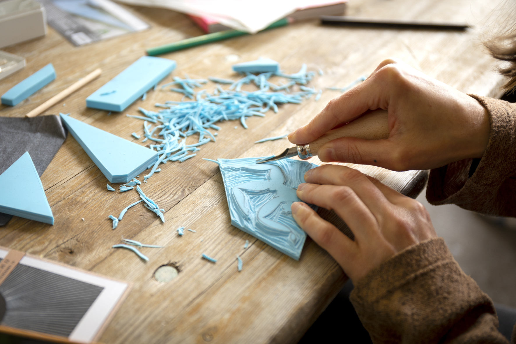 In der Werkhalle wurde im Rahmen der Ausstellung aber nicht nur Kunst ausgestellt – sie wurde dort auch geschaffen. Im Rahmen von zwei Workshops führte Nadine Interessierte in den Ablauf des Linoldrucks ein und eröffnete somit Raum für angewandte Kreativität. Im Rahmen des Verfahrens werden sogenannte Softcutplatten zu Stempeln umgearbeitet, in dem gewisse Teile der Platte abgetragen werden. Anschließend wird die Farbe dann mit Walzen auf die „Stempel“ aufgetragen und auf Papier gedruckt. Bis dato hat Nadine die Workshops immer nur mit Kindern und Jugendlichen umgesetzt. Die Umsetzung gestaltet sich mit Erwachsenen hingegen wesentlich simpler, da oftmals bereits umfängliche Vorstellung für die Technik und den Entwurf besteht. Durch die Umsetzung der Workshops überträgt Nadine ihre Arbeit als Kunstpädagogin und Designerin in gewisser Weise auf den außerschulischen Bereich und kombiniert ihre eigenen künstlerischen Arbeiten mit didaktischen Lehrmethoden. Die Workshops wurden mithilfe einer finanziellen Förderung durch den Mirker Quartiersfonds ermöglicht.