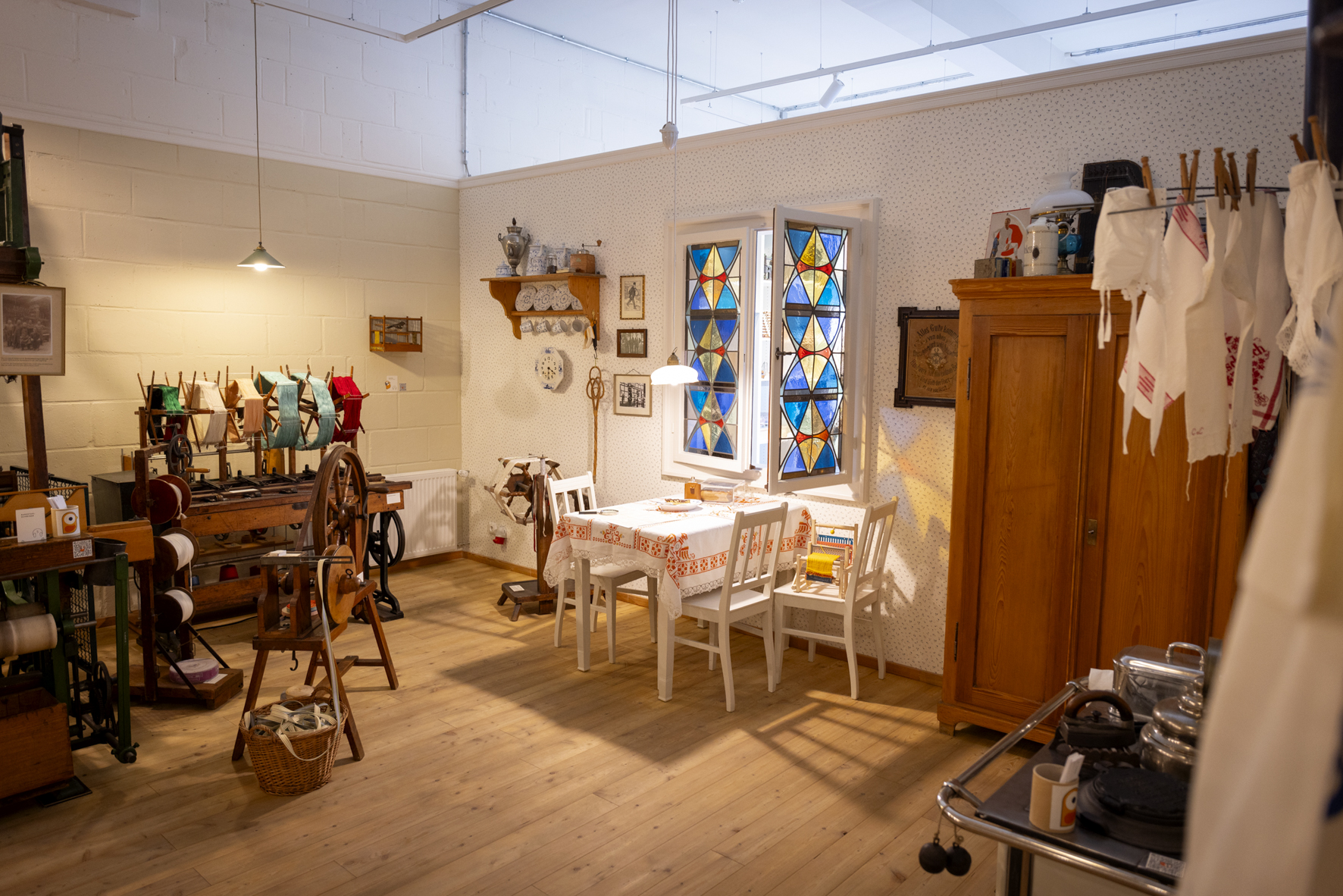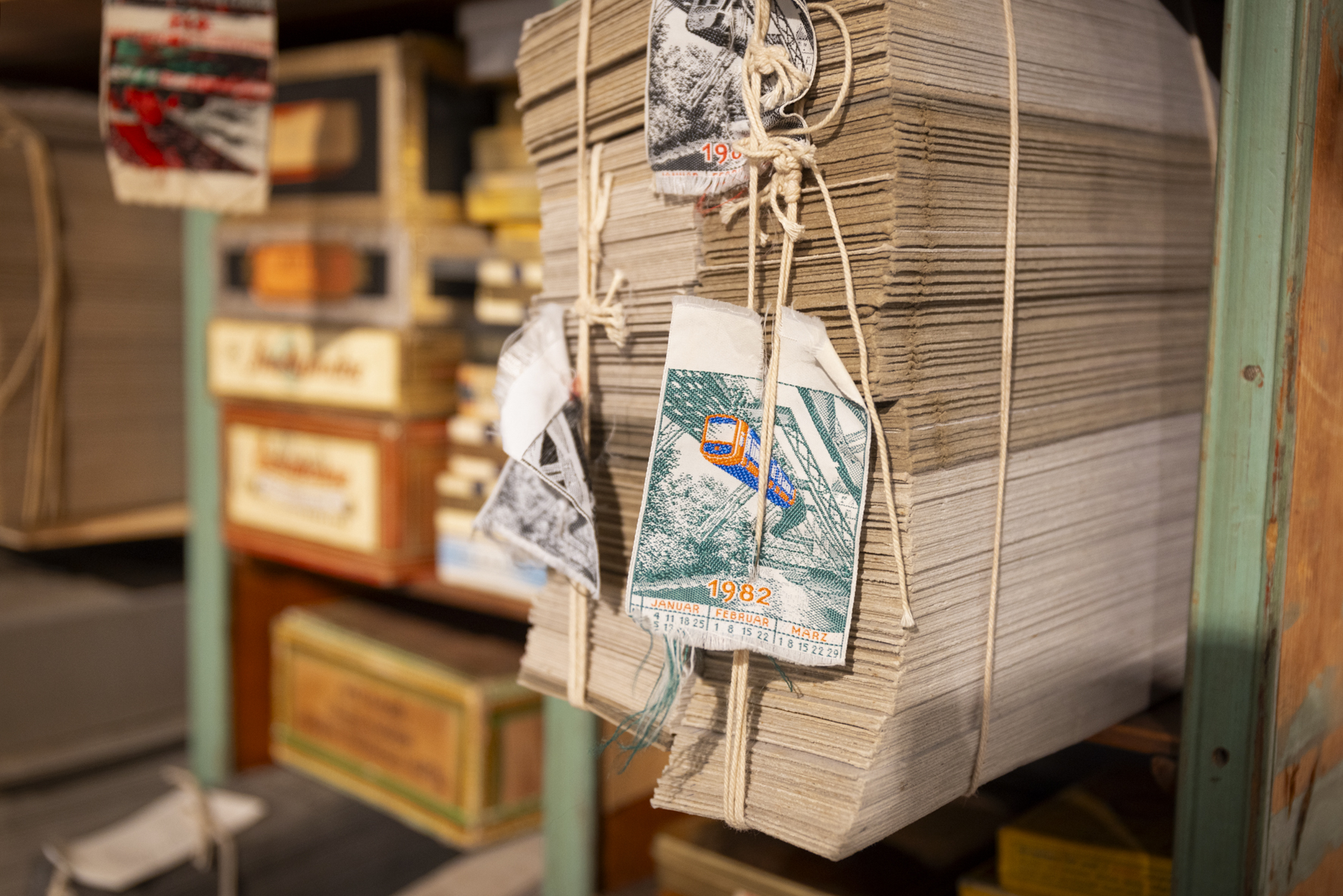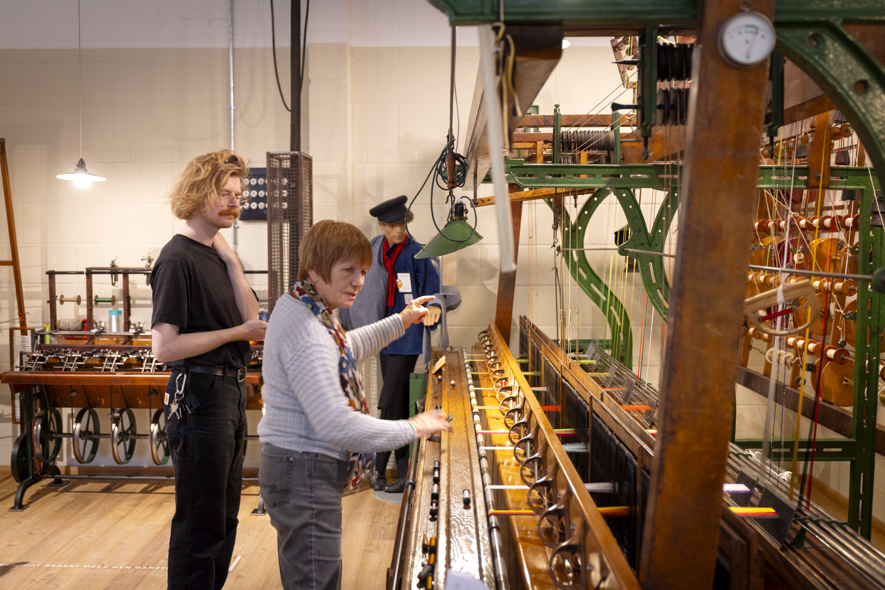 Das Bandwebermuseum ermöglicht heute einen lebendigen Einblick in über 100 Jahre Bandweberindustrie. Anfangspunkt der Ausstellung ist dabei eine stilechte Hausbandweberstube, in der die Besucher*innen am eigenen Leib erfahren können, wie die Menschen vor über 100 Jahren im heutigen Wuppertal lebten. Neben einem kleinen Holzofen, einem hölzernen Schrank und einem Tisch mit drei Stühlen ist der mit Blümchentapete eingekleidete Raum vor allem von dem Schachten-Webstuhl und den dazugehörigen Maschinen und Werkzeugen bestimmt. Werkstatt und Wohnraum sind damals untrennbar miteinander verwoben und eine strikte Trennung zwischen Berufs- und Familienleben undenkbar. Kein Wunder, denn damals halfen alle Familienmitglieder bei der Produktion der Textilien. Während die Erwachsenen am Webstuhl arbeiteten und sich um den Betrieb kümmerten, halfen ihnen ihre Kinder bereits ab drei Jahren mit einfachen Tätigkeiten bei der Fertigung der Bänder. Der hier ausgestellte Schachten-Webstuhl kam am 24. Dezember 1907 in die Familie des Vorbesitzers und wurde hier über 80 Jahre betrieben, bevor er in die Hände von Pesch und den anderen Ehrenamtler*innen übergeben wurde. In seinen besten Zeiten webte die Maschine wöchentlich bis zu 100 Meter Band pro Arbeitsstelle und produzierte damit den Lebensunterhalt der Familie. Doch die spezifische Einstellung der Maschine dauerte je nach Komplexität des zu webenden Bandes mit zwei geschulten Personen 1-3 Wochen, wobei die Zeit der Einstellung nicht bezahlt wurde. Das erklärt unter anderem die enormen Arbeitszeiten und die heute zu Recht verbotene Kinderarbeit, die zur damaligen Zeit jedoch üblich war. Wie auch alle anderen Maschinen im Museum, ist erfreulicherweise auch dieser Webstuhl funktionstüchtig. Als Pesch den Webstuhl für uns zum Leben erweckt, bebt der Boden und es wird deutlich, in was für einer Atmosphäre die Wuppertaler*innen, die damals wohlgemerkt noch keine waren, lebten. Der ohrenbetäubende Lärm der Maschine, die Takt für Takt, die Fäden zu Bändern werden lässt, ist allgegenwärtig.