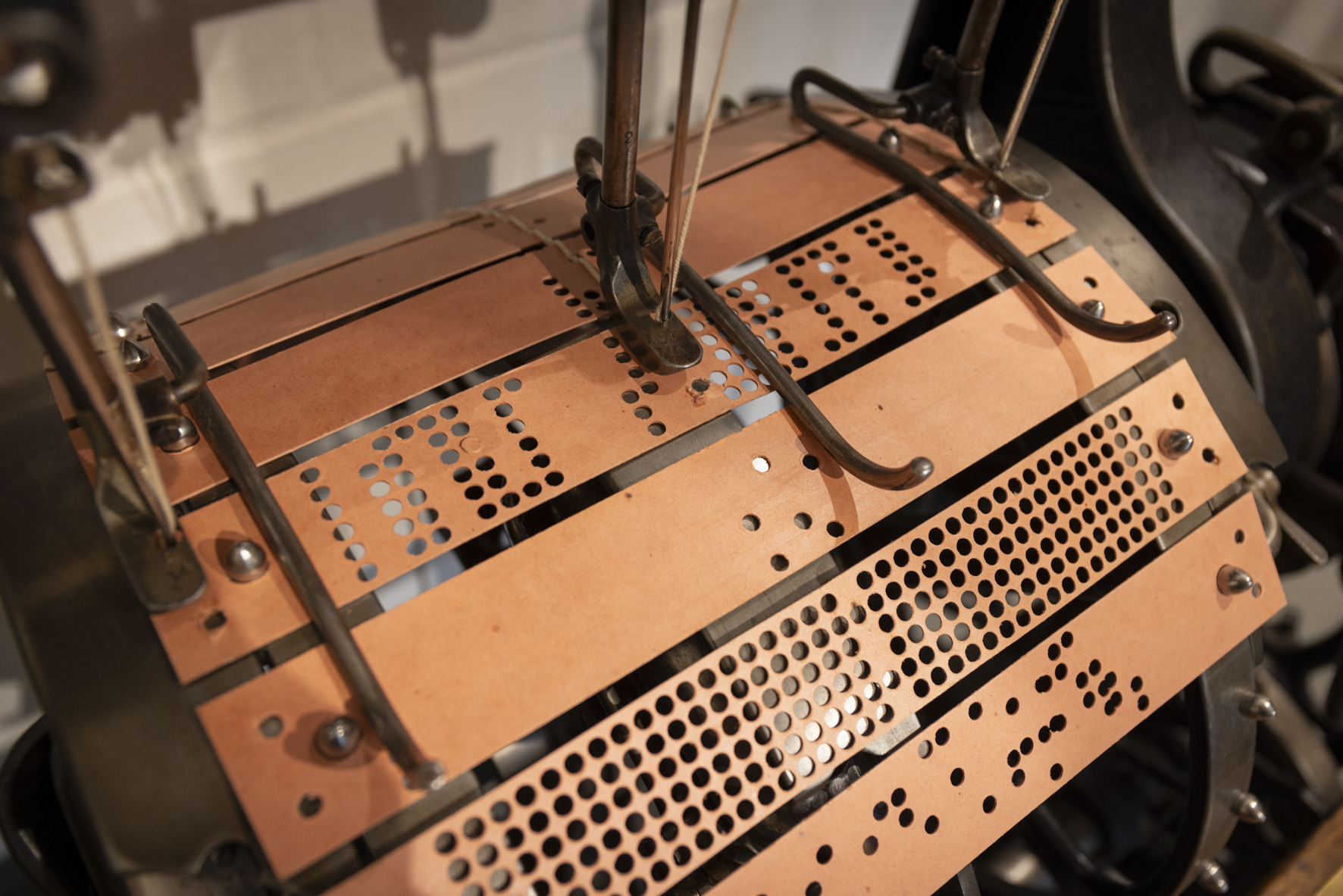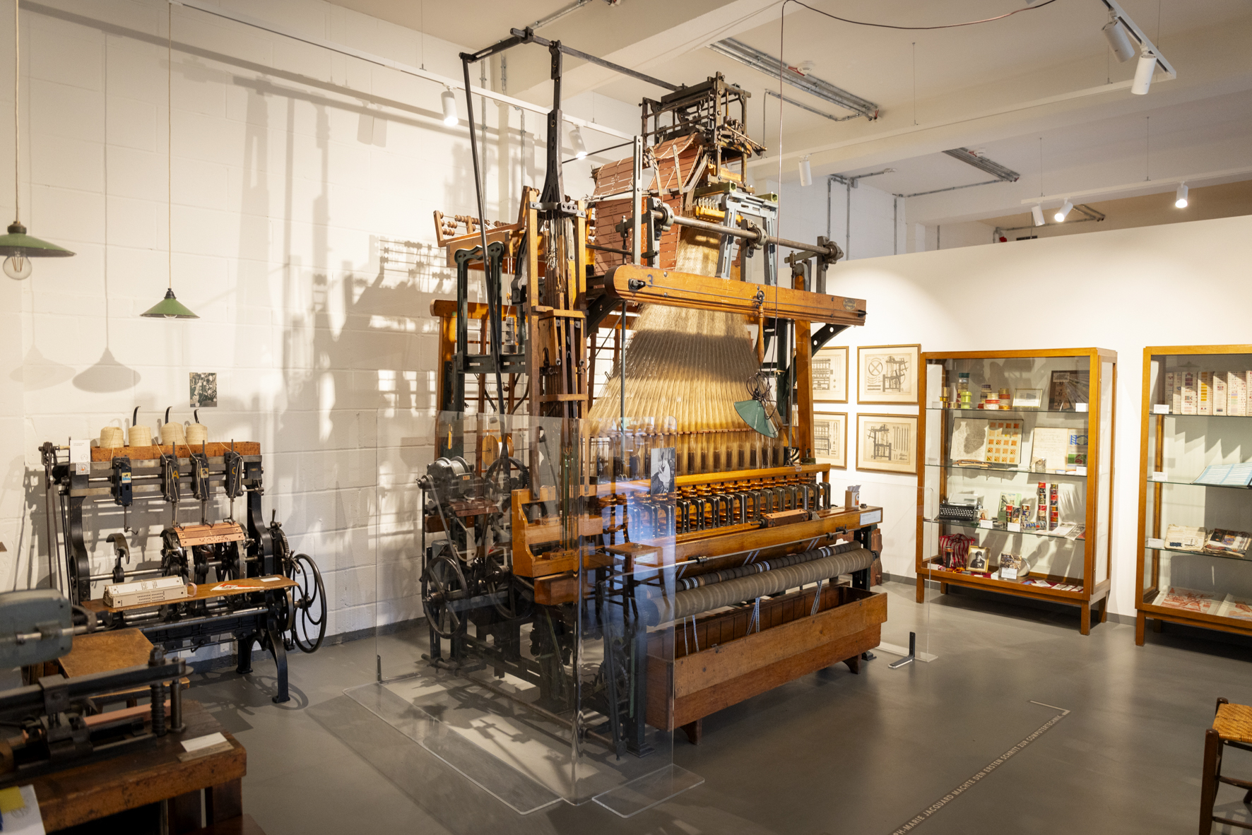 Im benachbarten Raum stellt das Bandwebermuseum weitere Webstühle und Flechtmaschinen aus. Darunter auch ein „halber“ funktionstüchtiger und historischer Jacquardwebstuhl, der vom Vorbesitzer aus Platzgründen von der mit einem Beil und einer Säge halbiert wurde. Einst standen 40 dieser Webstühle in doppelter Länge auf der Etage der Gold-Zack Fabrik und produzierten die berühmt-berüchtigten Gummibänder mit den goldenen Zackenmustern. Der Jacquardwebstuhl arbeitet mit sogenannten Lochkarten, die es der Maschine ermöglichen, binären Code auf gelochten Karten in komplexe Webmuster zu übersetzen. Er wurde von dem gleichnamigen französischen Erfinder und Sohn eines Webers Joseph-Marie Jacquard 1805 entwickelt und schnell zum industriellen Standard für gemusterte Textilien, weil sie jeden Kettfaden einzeln ansteuern können, statt lediglich ganze Gruppen von Fäden. Zahlreiche der ausgestellten Kunstwerke und Textilien konnten mithilfe dieser Technik mit wesentlich geringerem Aufwand produziert werden. Aber auch eine weitaus modernere Maschine in Form eines Hightech-Nadel-Automaten sind Teil des Museums. Mit ähnlichen können etwa Zubehörteile für schusssichere Westen oder Spanngurte hergestellt werden können.