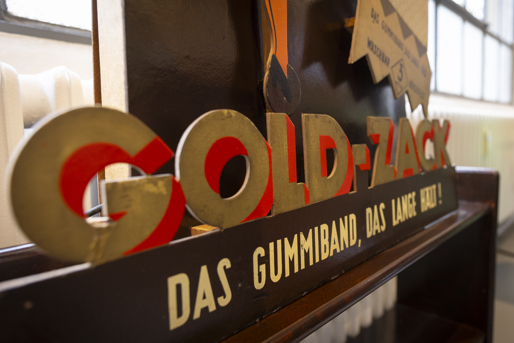 Schon bevor es überhaupt denkbar gewesen wäre, dass das Bandwebermuseum in die ehemalige Gold-Zack Fabrik ziehen würde, sammelten die Ehrenamtler*innen immer mehr Ausstellungsstücke, die Bezüge zu Gold-Zack hatten. Den krönenden Abschluss der Sammlung stellt ein ehemaliger Werbeaufsteller dar, auf dem eine Person zu sehen ist, die durch einen Mechanismus an einem großen Gummiband der Firma mit den ikonischen goldenen Zacken zieht. Pesch erzählt, dass auf der Rückseite des Ausstellers steht, dass dieser nach Nutzung stets zurück in die Gold-Zack Werke zu bringen ist. Nach über 70 Jahren hat er es vor kurzem nun zurückgeschafft und steht jetzt an Ort und Stelle.