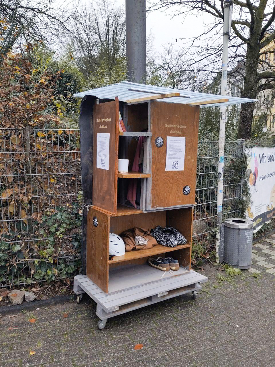 Wer in den letzten Monaten interessiert durch die Elberfelder Quartiere geschlendert ist, dem*der dürfte die Arbeit der Gruppe „Solidarischer Aufbau Wuppertal“ nicht entgangen sein. Bei den Wiesenwerken, vor dem AZ Gathe, in der Charlottenstraße und am LOCH stehen Schränke im öffentlichen Raum, die dazu einladen, Gegenstände hineinzulegen und andere herauszunehmen. Was auf den ersten Blick banal klingen mag, offenbart dabei weitaus tiefgreifendere Wirkungen als gedacht. Welche Konsequenzen erwachsen daraus, den öffentlichen Raum wahrhaftig als kollektiv selbstverwalteten Raum zu verstehen, der Solidarität und Handlung bedarf? Was passiert, wenn wir uns öffentlichen Raum „einfach“ aneignen, statt auf Bürokratie und Verwaltung zu vertrauen? All diese Fragen haben etwas mit dem Aktivismus der Gruppe „Solidarischer Aufbau Wuppertal“ zu tun, die für die sogenannten „Tauschwägen“ verantwortlich sind. In einem Interview haben wir mehr über Ihre Intentionen, ihre Schwierigkeiten und Visionen erfahren.