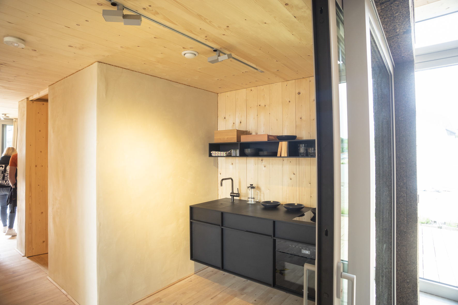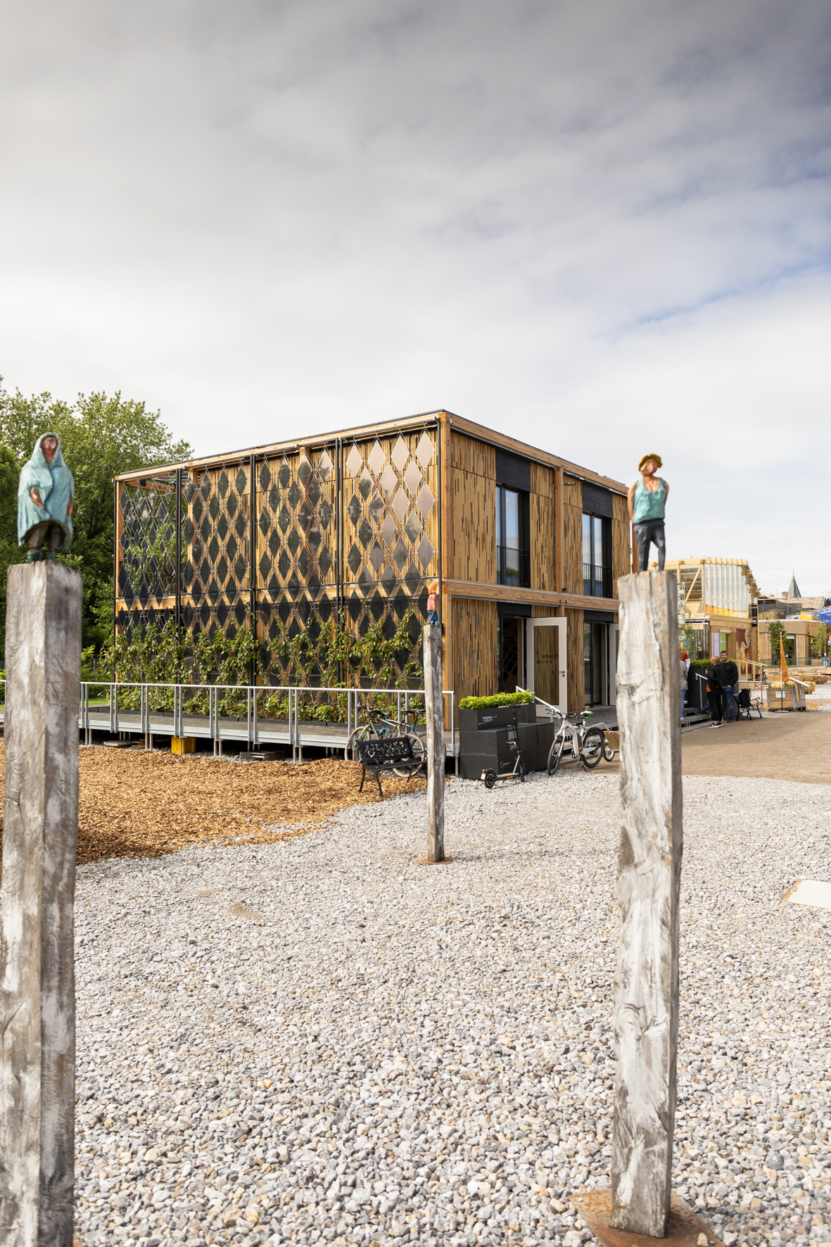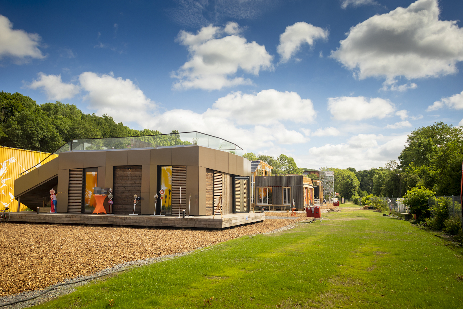 Viele der täglichen Trassenbesucher*innen und Wuppertaler*innen haben sich in den letzten Wochen gefragt, was hier eigentlich entsteht und auch wir waren gespannt darauf endlich ein Blick hinter die Fassaden werfen zu können. Nun warten 16 Häuser und Teams darauf, ihre materialisierten Ideen und Konzepte endlich vorzustellen und mit ihren Gebäuden in verschiedenen Disziplinen gegeneinander anzutreten. Überall tummeln sich Studierende, die den letzten Feinschliff an ihren Häusern vornehmen – einige von ihnen, um ihre Häuser überhaupt fertigzustellen. Denn aus diversen Gründen haben es nicht alle Teams geschafft, ihre Häuser rechtzeitig fertigzustellen. Deswegen bleiben uns einige Türen versperrt, doch die detaillierte Besichtigung der zwölf geöffneten Demonstratoren und der Flächen bedarf ohnehin mehr Zeit als wir an diesem Morgen aufwenden können. Die Einblicke, die wir bekommen sind allesamt beeindruckend, und zwar nicht nur in Bezug auf die kurze Zeit, in der die Konzepte verwirklicht wurden. Hinter jeder Wand und jeder Schraube stecken Ideen und Konzepte, die moderne Technik und Verfahren im Bauprozess real werden lassen. Die Konzepte zeigen auf, wie wir morgen wohnen könnten – vielleicht müssen – denn ressourcenschonendes Bauen und Nachhaltigkeit sind hier essenzielle Thematiken im Hinblick auf eine sich wandelnde Welt. Wir werden hier nicht versuchen, euch fachspezifische Bauthemen zu erklären. Das können wir nicht und wollen wir auch nicht. Aber auch für Menschen, die keinem Fachpublikum angehören, oder keinen Bezug zum Thema Bauen haben, garantiert die Veranstaltung einen spannenden Einblick in eine andere Welt, die sich in der Praxis realisieren lässt.