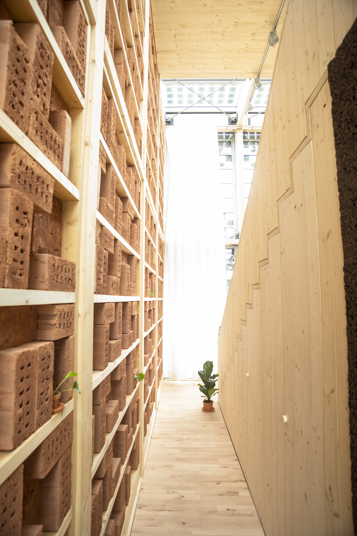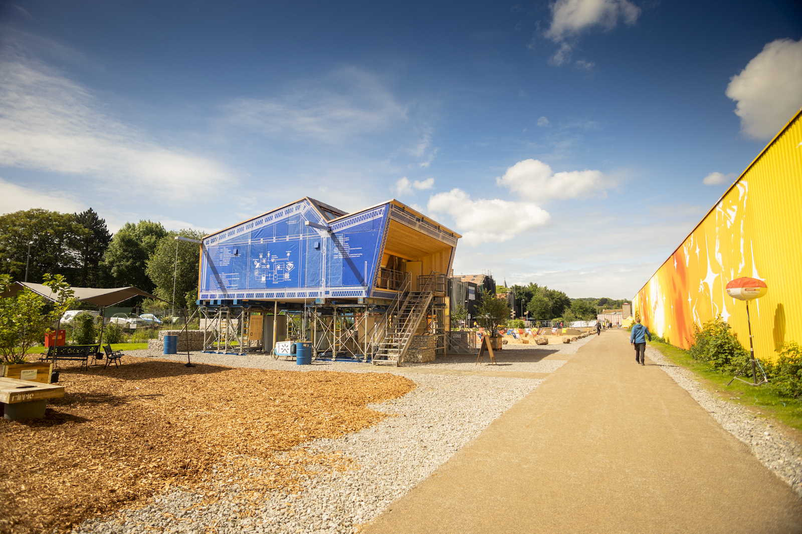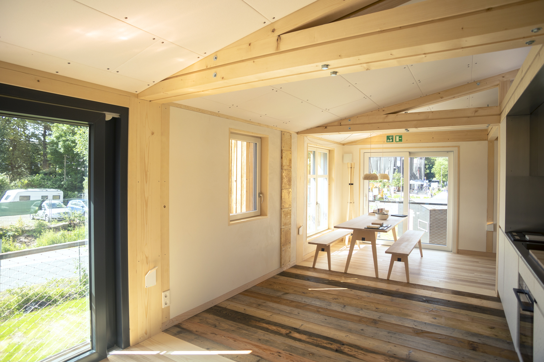 Viele der täglichen Trassenbesucher*innen und Wuppertaler*innen haben sich in den letzten Wochen gefragt, was hier eigentlich entsteht und auch wir waren gespannt darauf endlich ein Blick hinter die Fassaden werfen zu können. Nun warten 16 Häuser und Teams darauf, ihre materialisierten Ideen und Konzepte endlich vorzustellen und mit ihren Gebäuden in verschiedenen Disziplinen gegeneinander anzutreten. Überall tummeln sich Studierende, die den letzten Feinschliff an ihren Häusern vornehmen – einige von ihnen, um ihre Häuser überhaupt fertigzustellen. Denn aus diversen Gründen haben es nicht alle Teams geschafft, ihre Häuser rechtzeitig fertigzustellen. Deswegen bleiben uns einige Türen versperrt, doch die detaillierte Besichtigung der zwölf geöffneten Demonstratoren und der Flächen bedarf ohnehin mehr Zeit als wir an diesem Morgen aufwenden können. Die Einblicke, die wir bekommen sind allesamt beeindruckend, und zwar nicht nur in Bezug auf die kurze Zeit, in der die Konzepte verwirklicht wurden. Hinter jeder Wand und jeder Schraube stecken Ideen und Konzepte, die moderne Technik und Verfahren im Bauprozess real werden lassen. Die Konzepte zeigen auf, wie wir morgen wohnen könnten – vielleicht müssen – denn ressourcenschonendes Bauen und Nachhaltigkeit sind hier essenzielle Thematiken im Hinblick auf eine sich wandelnde Welt. Wir werden hier nicht versuchen, euch fachspezifische Bauthemen zu erklären. Das können wir nicht und wollen wir auch nicht. Aber auch für Menschen, die keinem Fachpublikum angehören, oder keinen Bezug zum Thema Bauen haben, garantiert die Veranstaltung einen spannenden Einblick in eine andere Welt, die sich in der Praxis realisieren lässt.