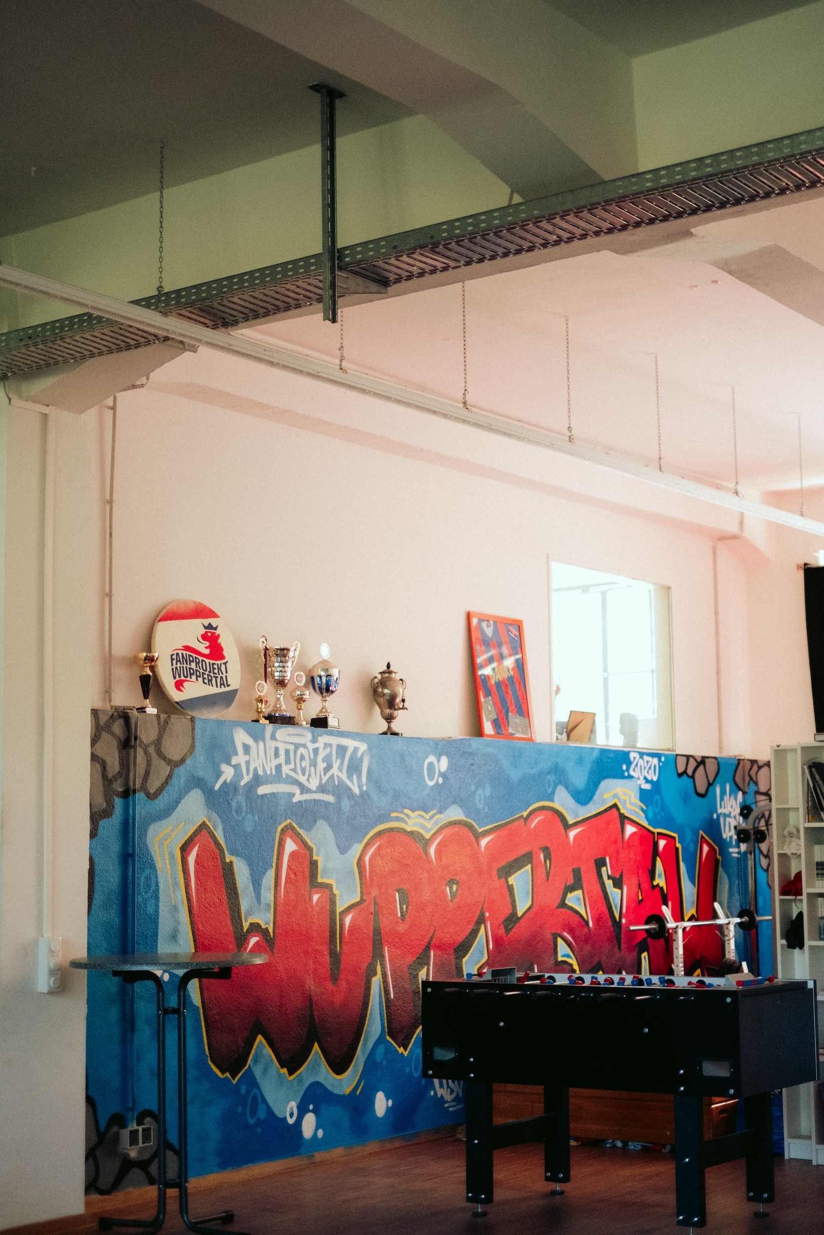 Derart wichtiges Engagement bedarf sichere Räume, die sich ihrer langfristigen Beständigkeit bewusst sein können. Seitdem die Montag Stiftung Urbane Räume das Gebäude übernommen hat und es fortwährend in die Wiesenwerke verwandelt, hat sich laut Lara, Nico und Lukas auch der Kontakt zu den anderen Mieter*innen intensiviert. Bereits vor der Übernahme existierten nachbarschaftliche Kooperationen mit den anderen Mieter*innen, sodass das Fanprojekt die Bühne des TalTonTheaters anlässlich der Fußball-Kulturtage für die Inszenierung eines Theaterstücks über Fußball in Wuppertal und Syrien nutzen konnte. Auch gelegentliche Ausflüge in die benachbarte Boulderhalle außerhalb der regulären Öffnungszeiten sind dadurch möglich. Mit der Übernahme durch die Wiesenwerke wurde laut Lara das Nachbarschaftsgefühl, z. B. durch das Involvieren der Mieter*innen in die Namensgebung des Projekts und die Sicherheit der langfristigen Beständigkeit der Mietverhältnisse, noch einmal intensiviert. Damit wurde klar: Das Fanprojekt Wuppertal wird auch fortwährend Teil des Quartiers bleiben und damit eine von vielen wichtigen Arbeiten und Engagements in einem so vielfältigen Quartier wie dem unseren realisieren.