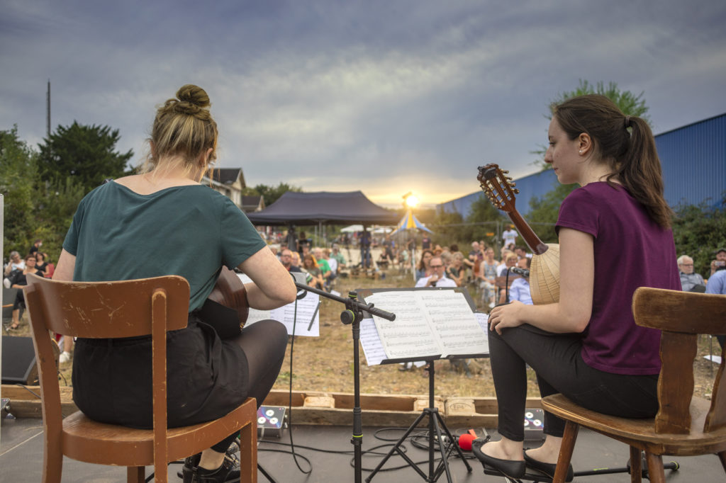 Anschließend fand eine kurze Pause statt. Clara Weise und Laura Engelmann, zwei Studierende der Mandoline am Wuppertaler Standort der Hochschule für Musik und Tanz Köln, begleiteten diese mit ihren Instrumenten und schufen somit ein Kontrastprogramm zum redelastigen Rest der Veranstaltung.
