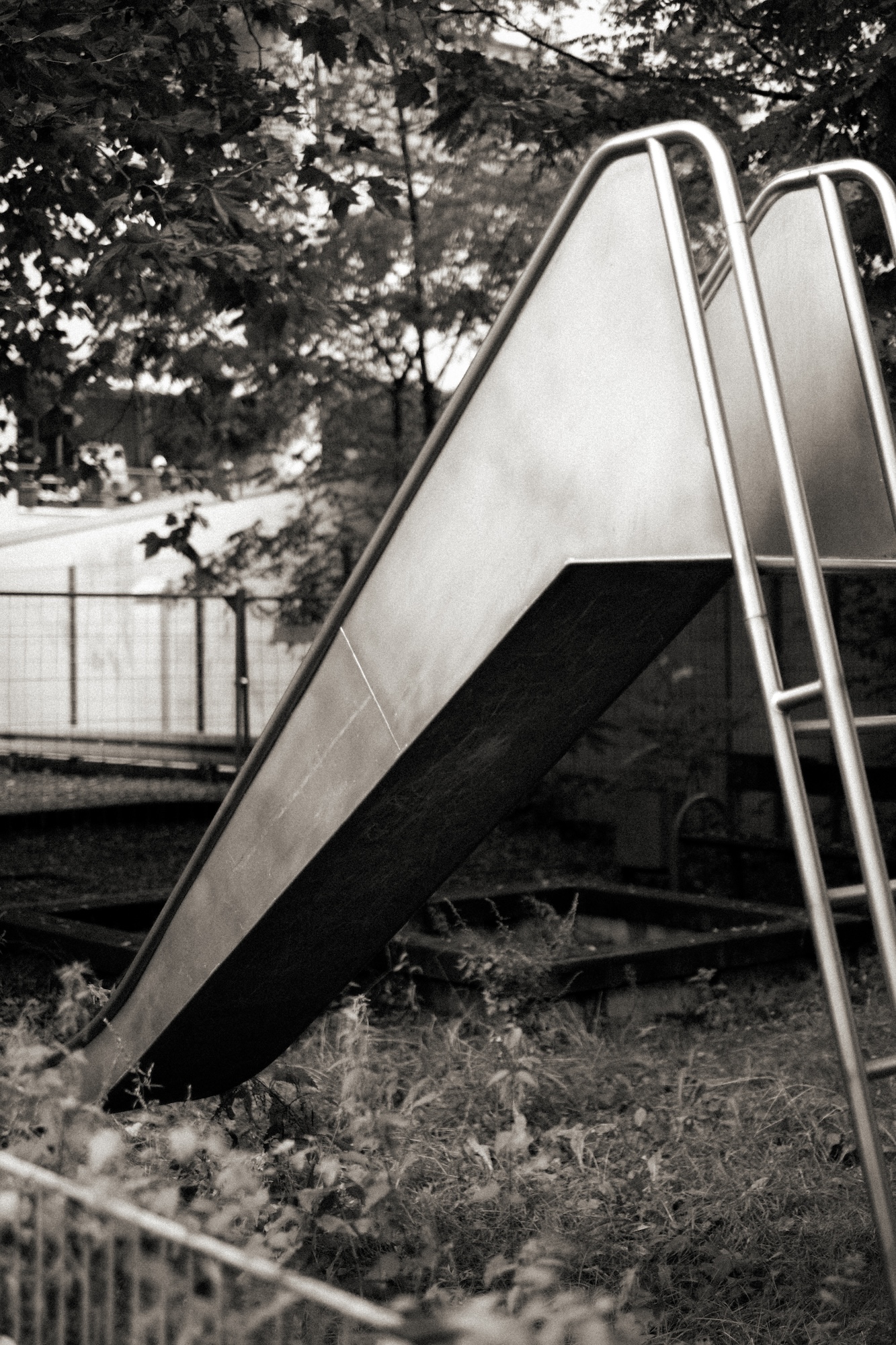 In der Zwischenzeit ballt sich am Himmel eine große Gewitterwolke zusammen, wir kürzen den Weg ab und wandern die Neue Friedrichstraße entlang. Wir erreichen den Parkplatz der Realschule – ein Schotterplatz, der im Moment zu keiner anderer Nutzung einlädt. Angrenzend zu dem Parkplatz fällt unser Blick auf einen trostlosen Spielplatz: Eine Rutsche, eine Schaukel, ein kleiner Sandplatz und darum hohes Gras. Seit einiger Zeit ist dieser Spielplatz abgesperrt, da wohl die Spielgeräte eher die Kinder gefährden, anstatt sie zum Spielen und sich zu bewegen anzuregen. Der Zugang zu diesem Spielplatz ist nur über den Garagenhof des Wohnhauses an der Wiesenstraße möglich. Sollte dieser Spielplatz reanimiert werden, hätten wir da ein paar Tipps, wie es schöner werden könnte.