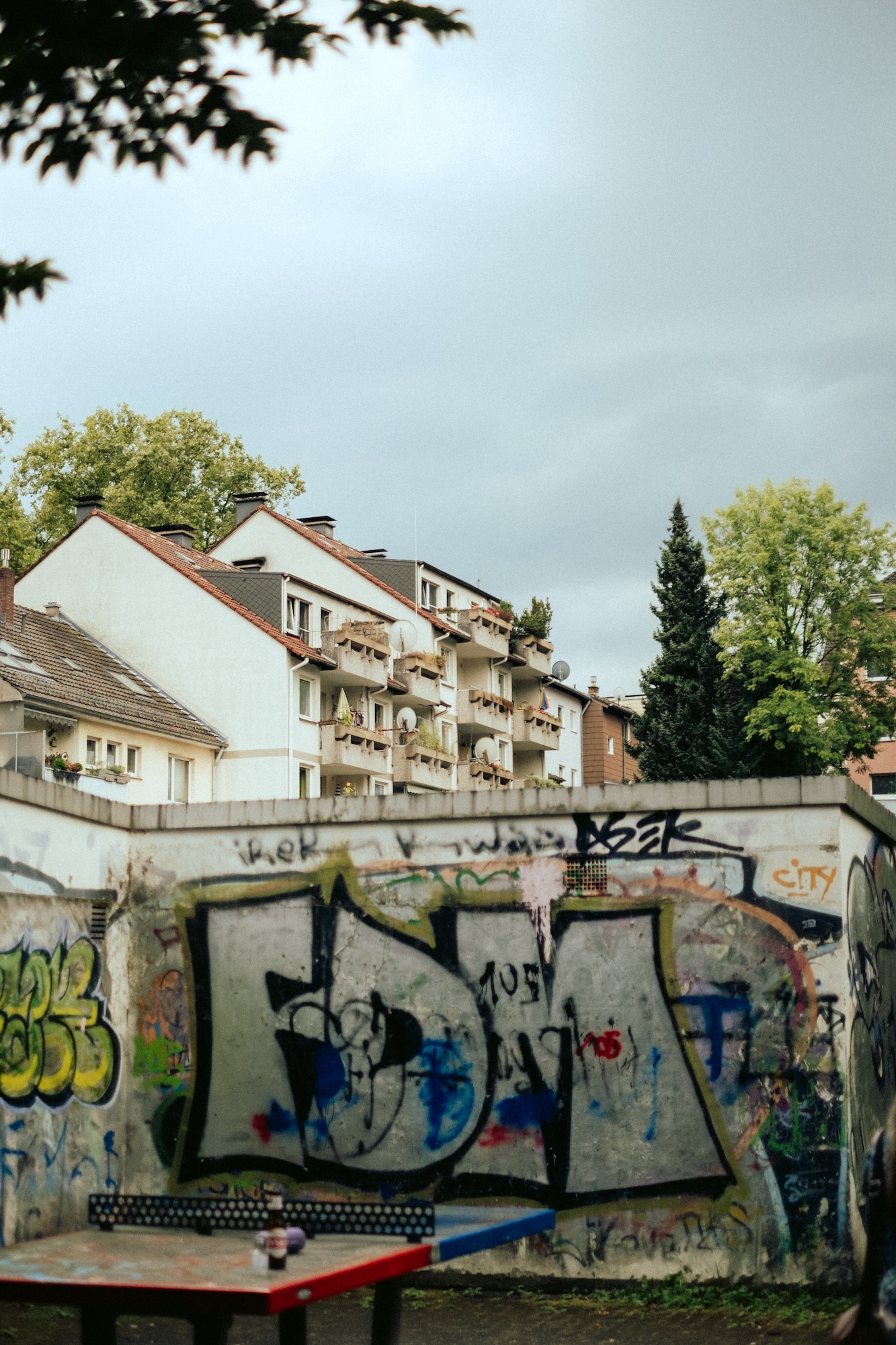Gegenüber dem Schulparkplatz überqueren wir die Neue Friedrichstraße und gelangen durch den Durchgang hinter dem ehemaligen Wirtschaftswunder auf einen öffentlichen Spielplatz mit kleiner Grünfläche, Bänken und Tischtennisplatte. An Nachmittagen wird der Platz wohl eher von Jugendlichen genutzt, um dort, nicht so gut einsehbar, ein wenig Party zu feiern. Wir plaudern mit eine paar Anwohner*innen, die den Abend dort genießen und wundern uns über verschiedene Hinterlassenschaften, die das Gelände dekorieren. Dieser Spielplatz liegt am Beginn eines Grünen Weges durch die Mirke, der parallel zu Wiesenstraße verläuft und durch Bäume verschatteten bis zur Bandstraße führt. Im Sommer eine angenehm kühle Wegeführung durchs Quartier. Ein Teilstück davon haben wir bereits beim 1. Spaziergang erkundet.
