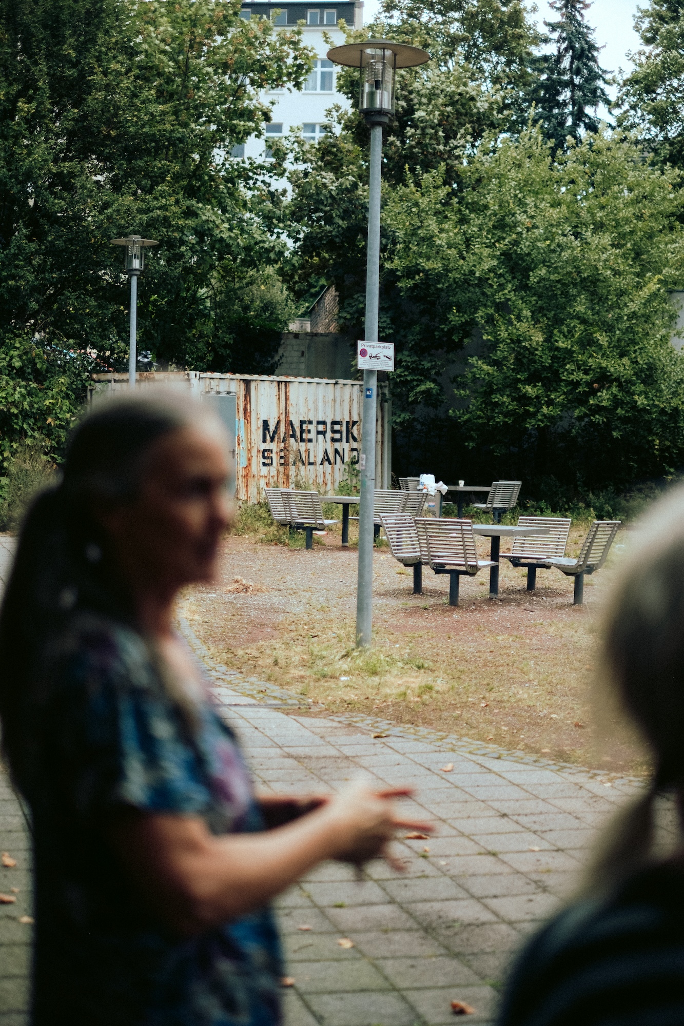Da das Gewitter sich nun echt zusammenballt, gehen wir direkt in den Garten des ADA, wo wir geschützt unter Sonnenschirmen ein Kaltgetränk genießen können und unsere Eindrücke austauschen. Seit einiger Zeit kümmern sich Engagierte von Insel e.V und den Urbanen Gärten darum, wie auf der Fläche mehr Grün entstehen kann. Als erstes wurde der Zugang abgepollert, so dass dort nicht mehr geparkt wird. Von fleißigen Helfenden werden jetzt grüne Inseln angelegt. So wurde mit Anheben der Steinplatten und der Bepflanzung der Zwischenräume mit blühenden Kräutern ein interessanter grüner Akzent gesetzt. Eine gute Idee zu zeigen, dass aus der Erde unter dem Pflaster sich durchaus etwas Grünes entwickeln kann.