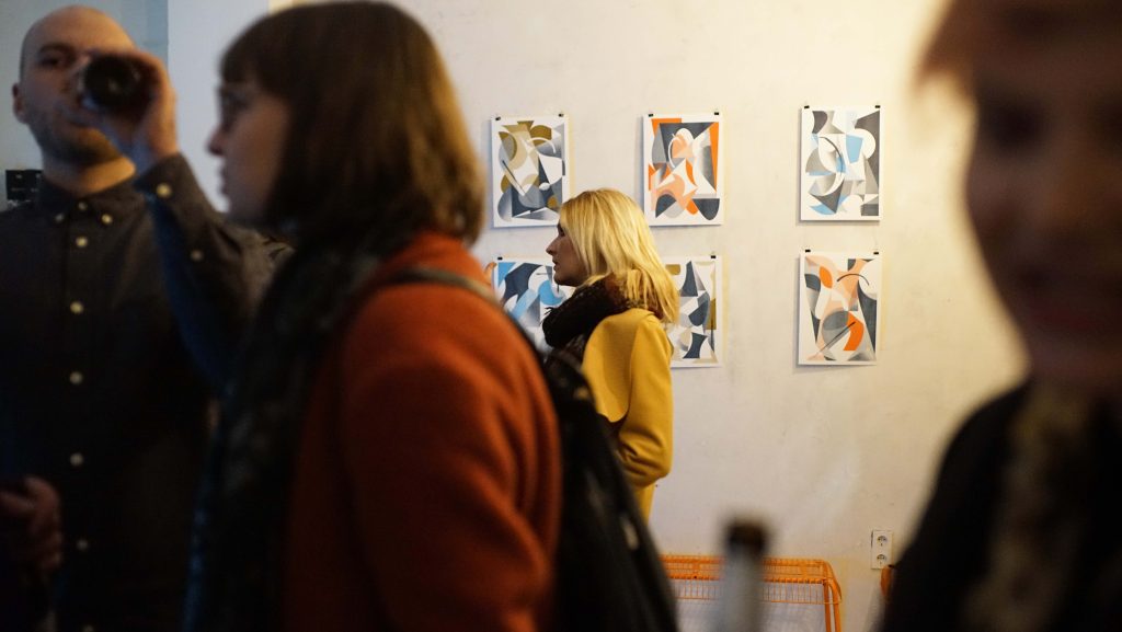 Wenn die zwei gerade keine Schaufenster bemalen, oder in geselliger Runde kunstinteressierter Menschen ein Bier genießen, dann laufen sie mit Pinsel und Farbeimer herum. Ihr Spiel mit Form und Farbe ist sonst auf großen Hauswänden und Toren zu bestaunen, doch heute stehen ihre bedruckten Risoprints im Vordergrund. Kaum zu übersehen, hängen sie liebevoll platziert an der Wand. Wenn man sich die Drucke eine längere Zeit anschaut, merkt man wie sehr betont.es das Spiel mit Form und Farbe liebt. Formen werden dekonstruiert und mit Hilfe von ausgewählten Farbe entsteht etwas sehr neuartiges. Design vom Feinsten! Komplettiert wird das Ganze durch das Schaufenster Design. Egal ob auf Hauswand oder Papier, diese Kunstwerke laden einen ein stehen zu bleiben, und sie bis aufs kleinste Detail zu studieren.