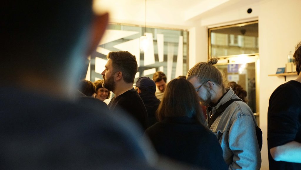 Im Inneren ist es gemütlich. Zwischen lokal produzierten Produkten flackern hier Kerzen im Takt der elektronischen Musik. Rund 30 Menschen, egal ob groß oder klein, unterhalten sich angeregt bei einem Getränk ihrer Wahl und starten in den Abend. Die Nachbarn beobachten das Geschehen neugierig von der anderen Straßenseite. Ein Hund schnüffelt zwischen der Vielzahl an Beinen umher, während interessierte Besucher*innen auf dem Sitzkissen im Schaufenster platz nehmen. Mitten drin steht das Künstler Kollektiv betont.es. Wegen ist das Kiosk am heutigen Abend Anlaufpunkt für so viele Menschen – Tumult auf Risoprints.