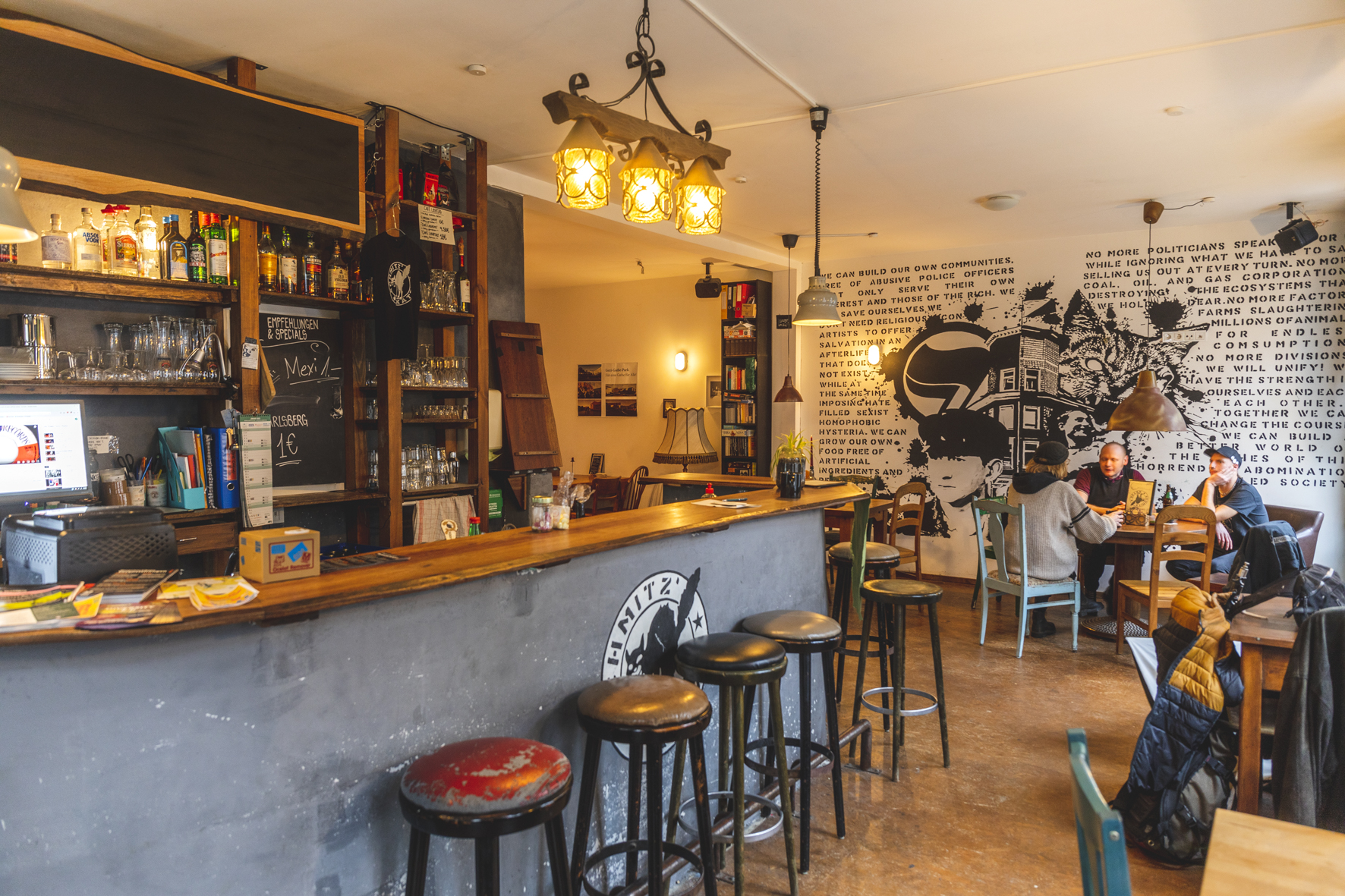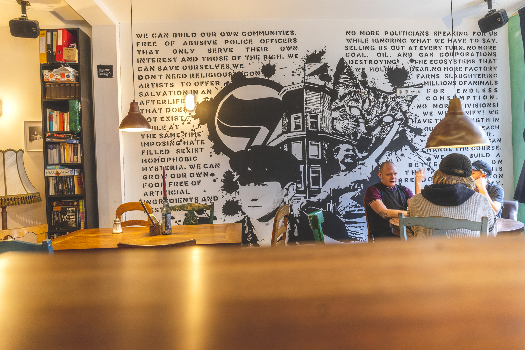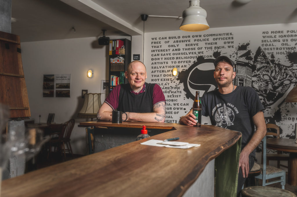 Die Kerngruppe des Schmitz‘ Katze Kollektiv besteht aus ca. 10–15 Menschen. Manche von ihnen befinden sich mitten in der Ausbildung, andere studieren und/oder gehen ihrer Lohnarbeit nach. So auch Marius und Timo, die beide Teil des Kollektivs sind und sich in unterschiedlichen linken Subkulturen und politischen Gruppen aktiv organisieren. Die Gruppe fand sich Anfang 2020 im ehemaligen Info-Café auf der Wiesenstraße zusammen, weil sie ein Begehren teilten. Der Diskurs um konkrete Gentrifizierungsakte auf dem Ölberg und die Schließung der ehemaligen linken Kneipe »Multi Kulti« auf der Hochstraße hatten eine Lücke hinterlassen. Es fehlte abseits des AZs (Autonomes Zentrum) an linken Räumen, in denen man sich austauschen und organisieren konnte. Gemeinsam begegneten sie ihrem Begehren mit Aktionismus, erarbeiteten gemeinsam eine Vision und begannen mit der Suche nach Räumlichkeiten in der Elberfelder Nordstadt. Fündig wurden sie Ende 2020 in der Hochstraße 23. Während der umfangreichen Renovierungsarbeiten zeichneten sich dann die Einschnitte der aufkommenden Covid-19 Pandemie ab. Doch das hinderte das Kollektiv nicht daran, im Juni 2021 unter coronakonformen Auflagen die Türen zu öffnen.