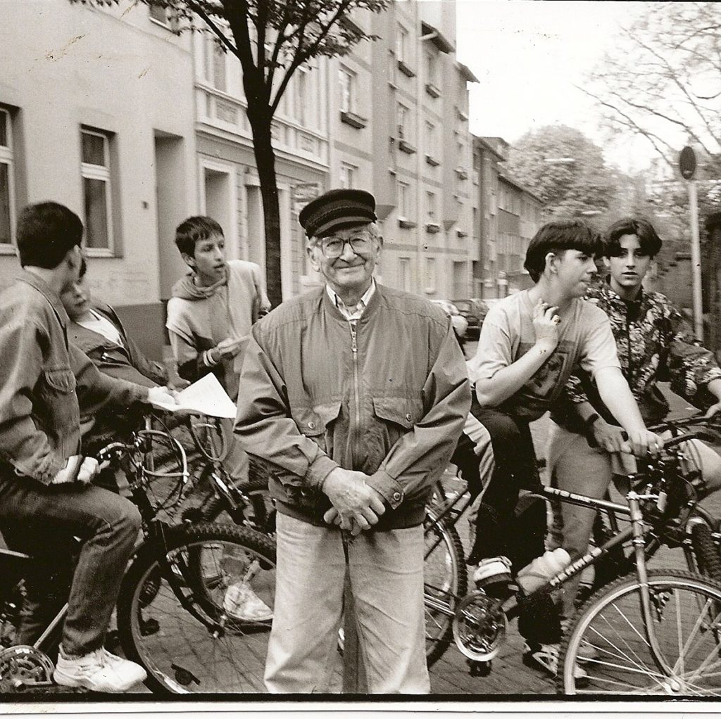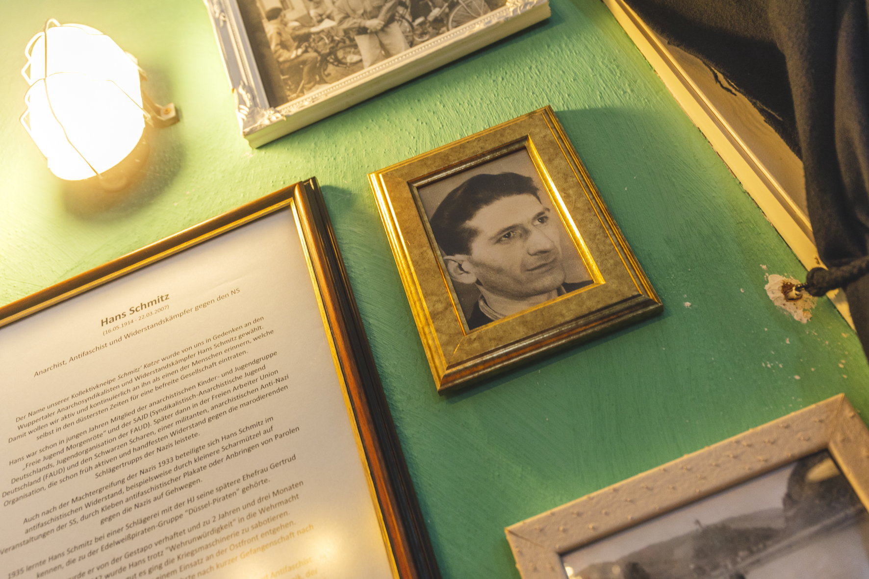 Die Kneipe benannten sie nach dem Wuppertaler Anarcho-Syndikalisten und Antifaschisten Hans Schmitz, der 2007 verstarb. Er kämpfte unter enormer Repression als Mitglied der Syndikalistisch-Anarchistischen Jugend Deutschlands (SAJD) gegen das nationalsozialistische Regime. Auch nach Beendigung des Zweiten Weltkriegs war Schmitz weiterhin politisch aktiv und erzählte von seinen Erfahrungen und Erlebnissen. Ohne Vorkämpfer*innen wie Hans Schmitz, die ihre Leben gegen die Gräueltaten der Nationalsozialist*innen stellten, wäre ein Ort wie dieser undenkbar. Das Kollektiv reiht sich mit der Namenswidmung in eine Reihe politischer Kämpfe ein und verortet sich bewusst als Fortleben dieser Bewegung. Das zeigt sich im Inneren des Ladens, wo einige Erinnerungen an Schmitz an der Wand hängen und ein großes Graffiti sein Fahndungsbild der Gestapo aufgreift. Hier ist auch die Schwarze Katze wiederzufinden – ein traditionelles Zeichen der anarchistischen und syndikalistischen Bewegung.