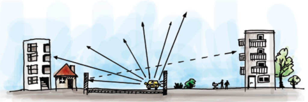 Beispiele für Lärmschutzwände und Lärmschutzwälle gibt es zahlreich. Die Wahl eines Lärmschutzwalls kann im Fall der A46 jedoch mit Sicherheit ausgeschlossen werden, da die dafür erforderlichen Flächen fehlen. Aber auch Lärmschutzwände haben in Wuppertal so ihre Tücken. Die Hanglage, an der die A 46 entlang geführt wird, reduziert die Schutzwirkung von Lärmschutzwänden enorm. Die Schallwellen, die in dem Bild als Pfeile dargestellt sind, finden ihre Wege über die Wände hinweg und tragen die Lärmemissionen somit über die Autobahn hinaus in umliegende Wohngebiete, wie das Mirker Quartier. Auch können Lärmschutzwände an sehr nahen an der Autobahn stehenden Gebäuden zu einer erhebliche Verschattung der Wohnungen führen.