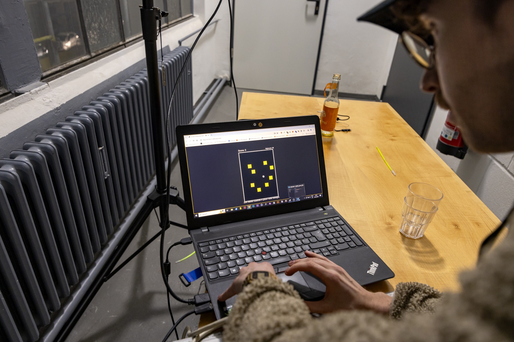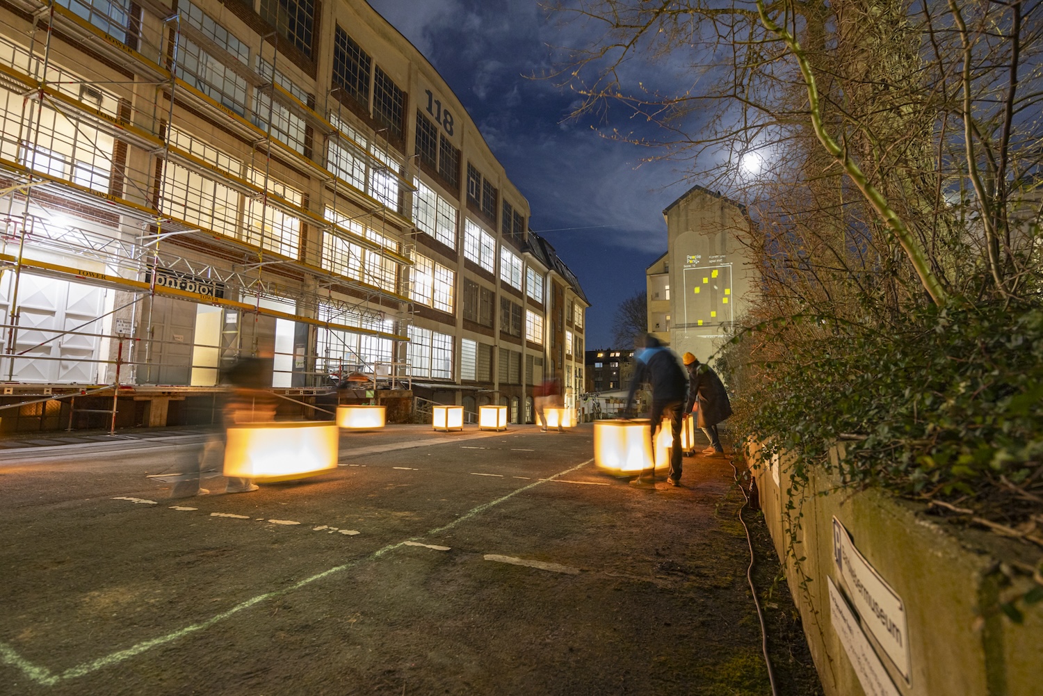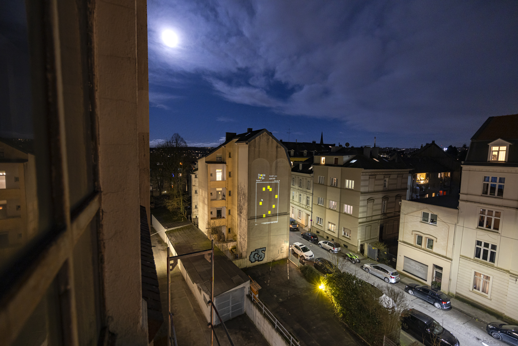 Bereits am vergangenen Samstag (17. Februar 2024) konnten Passant*innen und Nachbar*innen auf dem Grundstück der Wiesenwerke [Link] ein visuelles Spektakel erleben. Menschen schoben leuchtende Würfel über den dunklen Vorplatz, während auf der benachbarten Hauswand eine Fläche projiziert wurde, auf der gelbe Kästchen einen Ball davor bewahrten, das Spielfeld zu verlassen. Grund für diese ungewöhnliche Szenerie ist das Projekt „People Pong“ von Marvin Link. Als Masterstudent des Public Interest Design möchte er mit dem Projekt spielerisch Momente der Begegnung im Quartier schaffen.Â