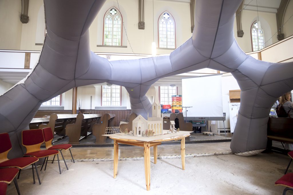 Der Innenraum der Kirche zog die Neugierigen mit einer Rauminstallation an. Ein riesiges, aufblasbares Gebilde, das aussah wie ein Konstrukt zwischen riesigem Iglu mit Fenstern und Beduinenzelt, symbolisierte den Wunsch der Initiative Kreuzkirche, entsprechende Installationen vielleicht in Zukunft z. B. für Besprechungsräume, Schlafkojen, Gruppenräumen in dem Kirchenraum aufzubauen. Herr Kerim Peter von Anadolu e.V. bewies, dass die alte orientalische Malkunst Ebru auch Menschen, die behaupten nicht malen zu können, phantastische Bilder entlockt.