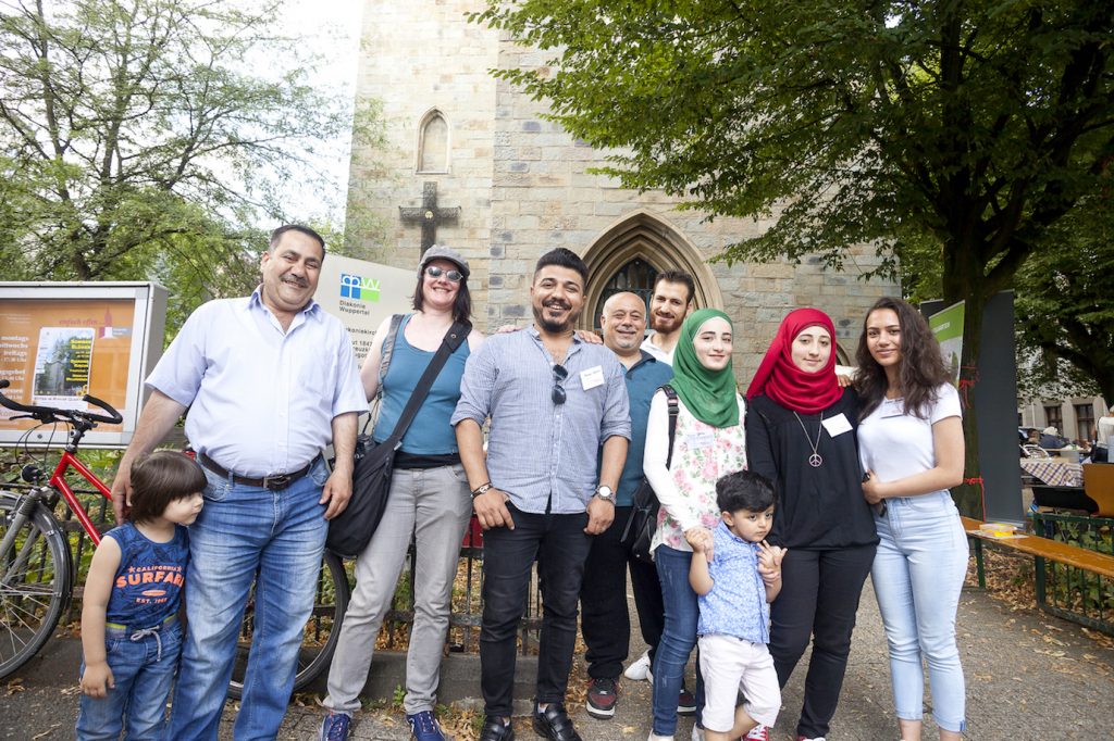 Aber es wurde auch gefeiert und nicht nur geredet. Es gab köstliche Speisen wie das syrische Tabule der Weißen Herzen, eine Gruppe Syrer*innen, die Spaß am guten Kochen habt, sowie den rheinischen Kartoffelsalat, der von Ehrenamtlichen der Diakoniekirche zubereitet wurde. Und die Grillwürstchen, die bei keinem Fest fehlen dürfen, gab es auch. Bewohnerinnen der Malerstraße steuerten den Kuchen zum Kaffee bei. Für Unterhaltung sorgte das Jugendrockprojekt Wuppertal, das die Bühne mit Gitarre und Gesang bespielte. Und die Kinder, die mit gemalten Schmetterlingen im Gesicht durch das Gelände schwebten, schminkte Steffi Kubick von 1qm Bildung.