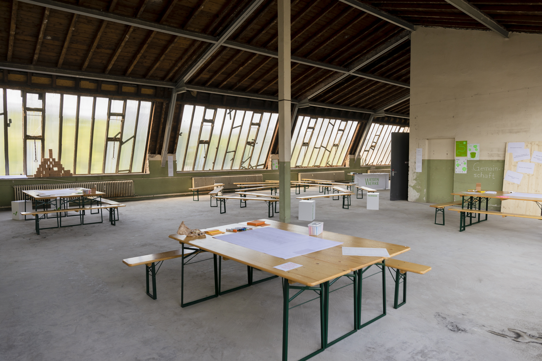 Bisher hat Natur auf den historischen Industrieflächen bloß Lücken gefüllt – das soll zukünftig nicht so bleiben. Unter der Rubrik „Grünraum“ wird deshalb über die natürliche Gestaltung der Flächen rund um das Gebäude gesprochen. Die Sammlung der Ideen, die sich von Gartenflächen, über Baumhäuser, bis hin zum Kneipbecken erstrecken, eröffnet vielfältige Möglichkeiten für die Gestaltung der Flächen und das Gefühl, das von ihnen ausgehen könnte. Werden die Außenflächen der Wiesenwerke zukünftig ein urbaner Ruhe- und Erholungsraum, an dem man in einer Hängematte das löchrige Blätterdach begutachten kann? Oder doch eher zu einem trubeligen Ort, an dem Generationen in Kontakt treten und gemeinsam spielerisch ihr Umfeld erkunden? Egal wie die Planung schlussendlich ausfällt, sollte die Entscheidung keinesfalls zulasten der bestehenden Grünflächen gefällt werden.
