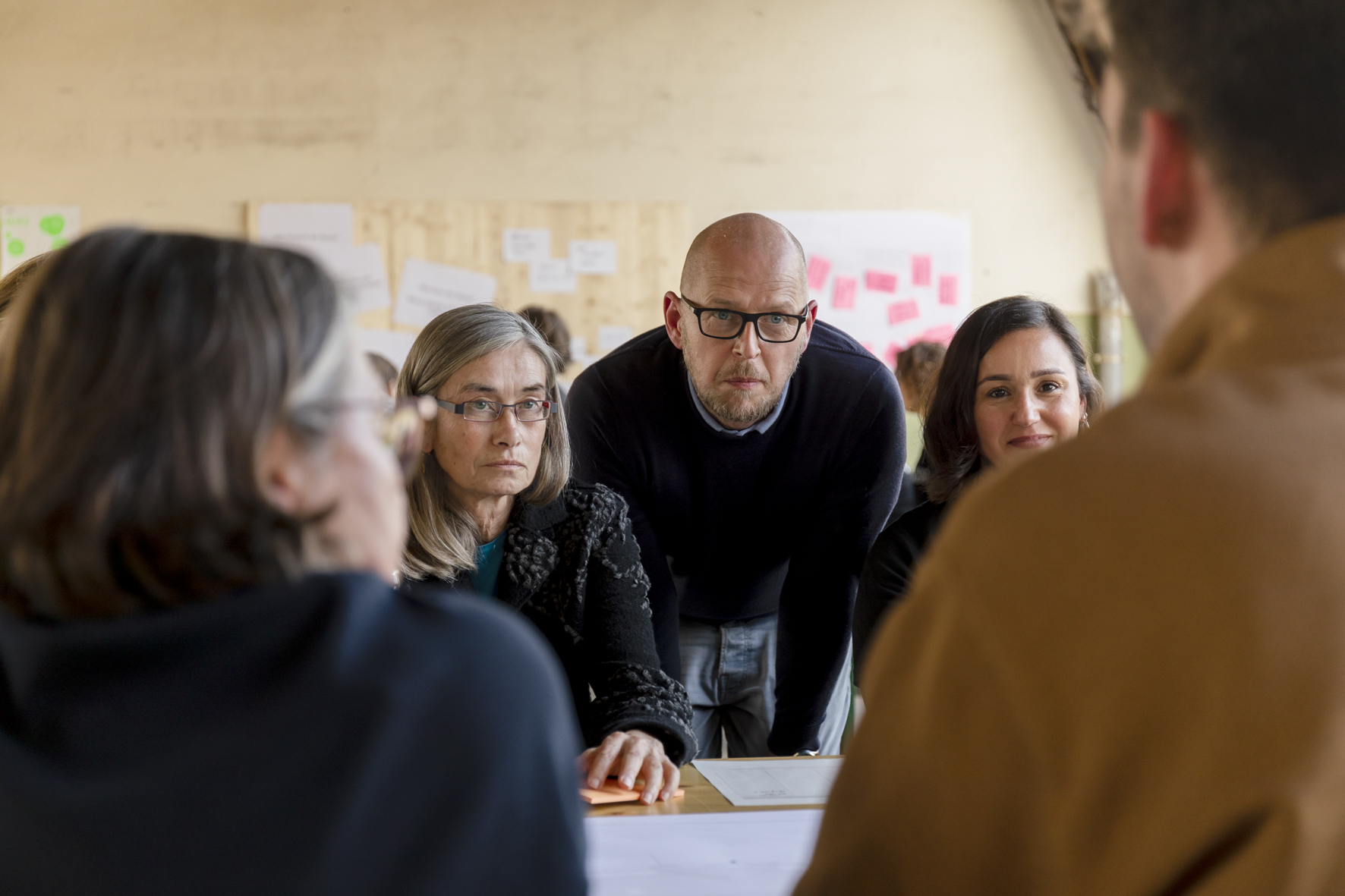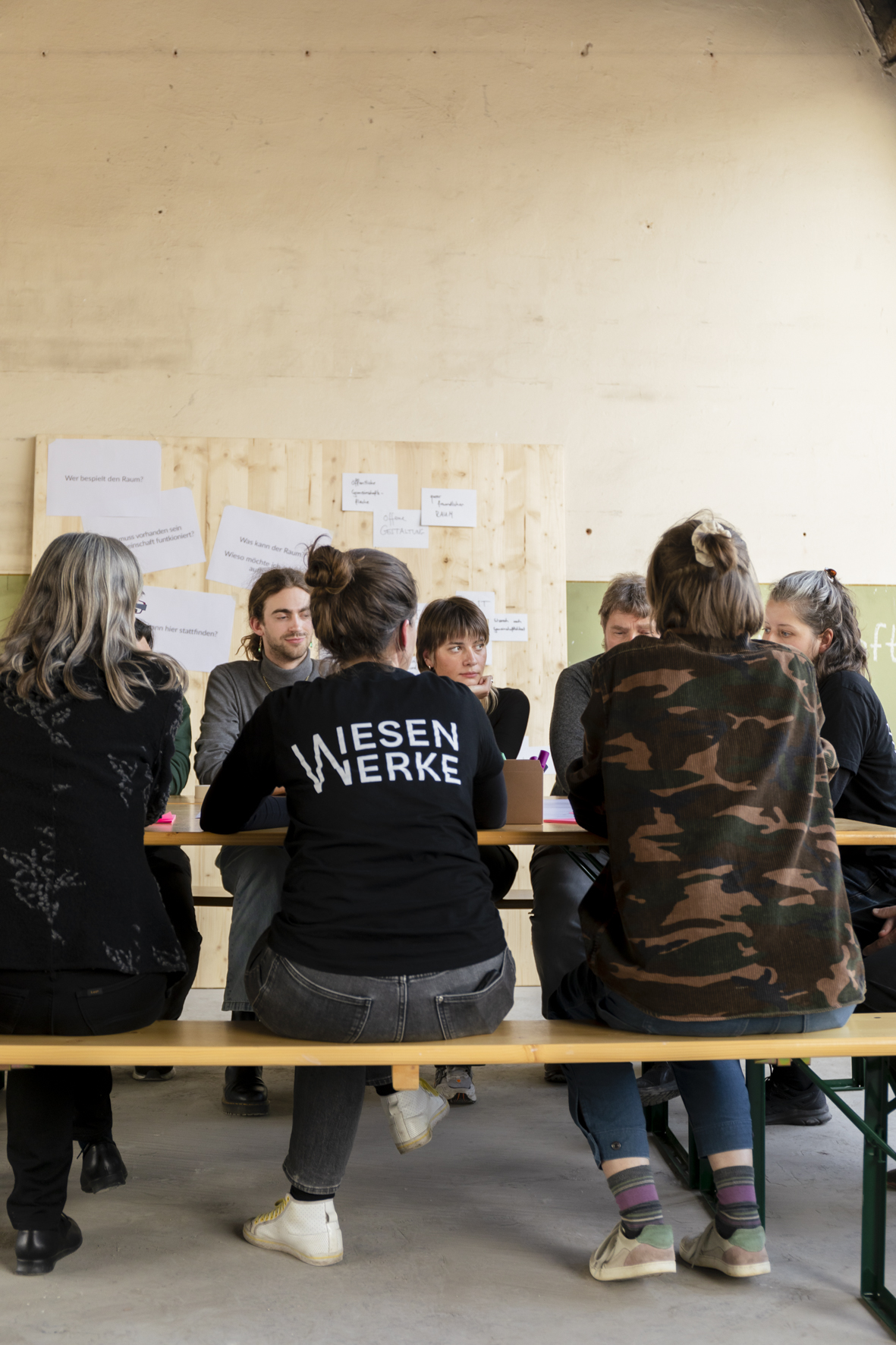 Unter der Rubrik „Gemeinschaft“ wird von der Beschaffenheit des Mobiliars bis hin zur raumübergreifenden Wirkung des Areals gesprochen. Dabei ist vor allem die Frage zentral, welche Folgen die objektive Aufwertung der Flächen für die umliegenden Räume und die Zugangsmöglichkeiten der diversen Besucher*innen hat. Schließlich ist es nicht im Sinne der Wiesenwerke, das historische Fabrikgebäude zu einem Elfenbeinturm innerhalb des Quartiers zu verwandeln. Die Teilnehmer*innen diskutieren daher, welchen Zweck die Gemeinschaftsfläche entlang der Wiesenstraße erfüllen könnte und wie sie möglichst einladend und zugänglich gestaltet werden kann. Dabei werden z.B. Wünsche nach qualitativen Aufenthaltsflächen ohne Konsumzwang, öffentlichen Toiletten, Marktflächen, einem Ort zum Boulespielen und entsiegelten Flächen geäußert.