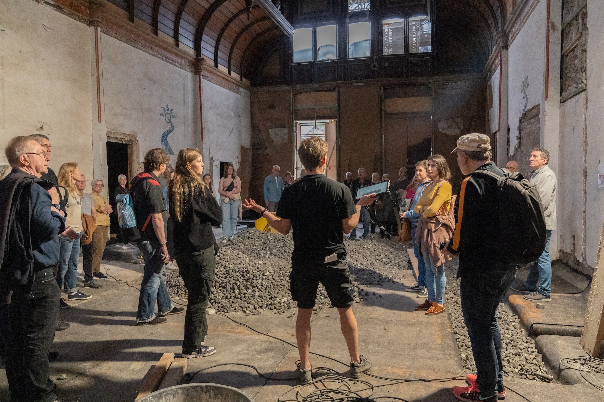 In Deutschland ist es fast schon Tradition, sich über die Langwierigkeit öffentlicher Bauvorhaben zu empören und manch ein*e Wuppertaler*in fragt sich schon seit geraumer Zeit, warum die Sanierungsarbeiten in Utopiastadt sich über einen so langen Zeitraum erstrecken. Woher kommt dieser Wissensdurst? Am Vortag wurde die Fassade des historischen Bahnhofsgebäudes teilweise von der schwarzen Plane befreit, die das Gebäude seit Jahren umhüllte. Darunter offenbart sich das Produkt der Arbeit der letzten Jahre in Form der sanierten Fassade, die seit Jahrzehnten nicht mehr solch einen Glanz an sich trug. Metaphorisch gesehen ist das vermutlich einer der Gründe für das Interesse. Hunderte Stunden ehrenamtlicher Arbeit wurden ungesehen hinter den Planen in das Gebäude gesteckt. Die knappen ehrenamtlichen Ressourcen erschöpften sich dabei in der Realisierung der Sanierung und weniger in der Kommunikation darüber. Amanda räumt ein, dass dadurch auch Raum für das Wachsen von Zweifel gegenüber der andauernden Sanierung „ohne sichtbares“ Ergebnis eröffnet wird, der in den Führungen durch kritische Nachfragen Ausdruck findet. Sie betont jedoch auch, dass sie sich im Rahmen der Führungen Zeit nimmt, derartige Fragen transparent zu beantworten und deutlich zu machen, dass große Teile Utopiastadts in ehrenamtlicher Arbeitszeit von Menschen organisiert werden, die selbst auch ein „normales“ Leben wie alle anderen führen. Die Führungen am Tag der offenen Tür sind als niederschwelliges Angebot zu verstehen, das es Interessierten erlaubt, mehr über das Projekt und den Rahmen der Umsetzung zu erfahren, ohne sich durch das Internet wühlen zu müssen. Dabei kommen übrigens immer wieder die gleichen Fragen und Thematiken auf – Fahrradspenden, Ungläubigkeit bezüglich des ehrenamtlichen Engagements und jede Menge spezifische Fragen zur Umsetzung der Sanierung.