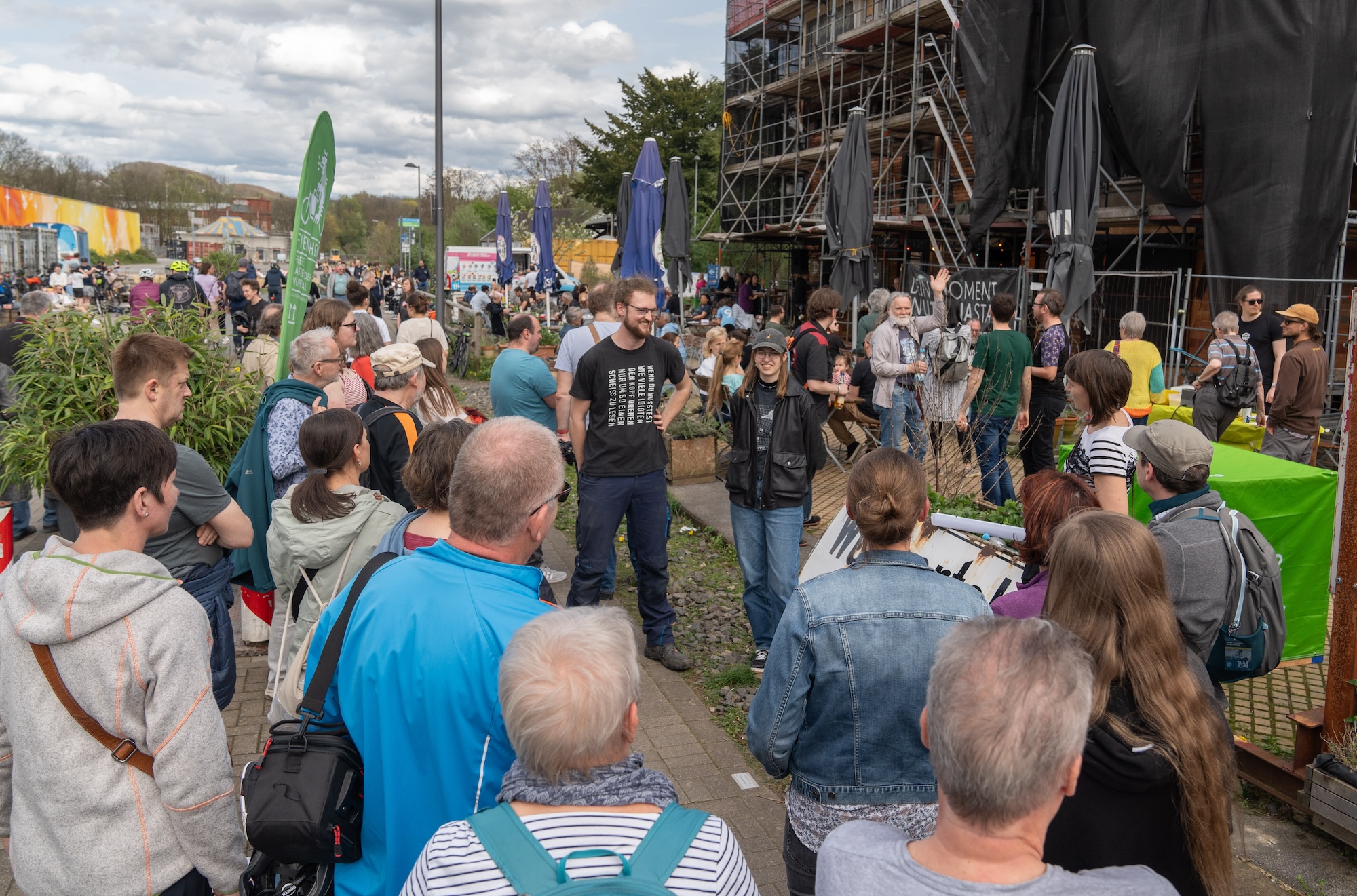 Auf den ersten Blick vielleicht ein verwunderlicher Zusammenhang. Schließlich ist es Teil des utopischen Selbstverständnisses, dass die Türen Utopiastadts zu jeder Zeit aufgestellt sind. Doch wie Amanda berichtet, ist der Tag der offenen Tür die logische Konsequenz der Erkenntnis, dass es einen Unterschied macht, eine Tür lediglich aufzuschließen, statt zusätzlich davorzustehen und hereinzubitten. Die heutige Veranstaltung ist somit als Ergebnis eines Lernprozesses zu verstehen, der Teil des Projekts ist. Und diese Erkenntnis findet bereits seit dem 1. April 2023 ihre Umsetzung. Damals fand der erste Tag der offenen Tür statt und das Wetter meinte es weniger gut mit den Utopist*innen. Es regnete in Strömen und alle zweifelten daran, dass sich überhaupt eine Seele nach Utopiastadt verirren würde, berichtet Amanda. Doch es kam anders: Besucher*innen pilgerten von ihrer Neugier angetrieben trotz des widrigen Wetters zum historischen Bahnhofsgebäude. Von dem großen Interesse überwältigt, wurde der nächste Tag der offenen Tür bereits im September 2023 veranstaltet. Heute findet der dritte Tag der offenen Tür statt und seitdem Utopiastadt sich zu einer Baustelle verwandelte, ist das Interesse der Wuppertaler*innen nach wie vor ungebrochen. Jegliche Führung ist voll besetzt und die Utopist*innen kommen im Rahmen ihrer ehrenamtlichen Engagements kaum hinterher, über den Stand der Dinge zu informieren. Der Tag der offenen Tür ist der Versuch, diese Informationslücke zu schließen und den Wuppertaler*innen das Tun und die Logik Utopiastadts näherzubringen.