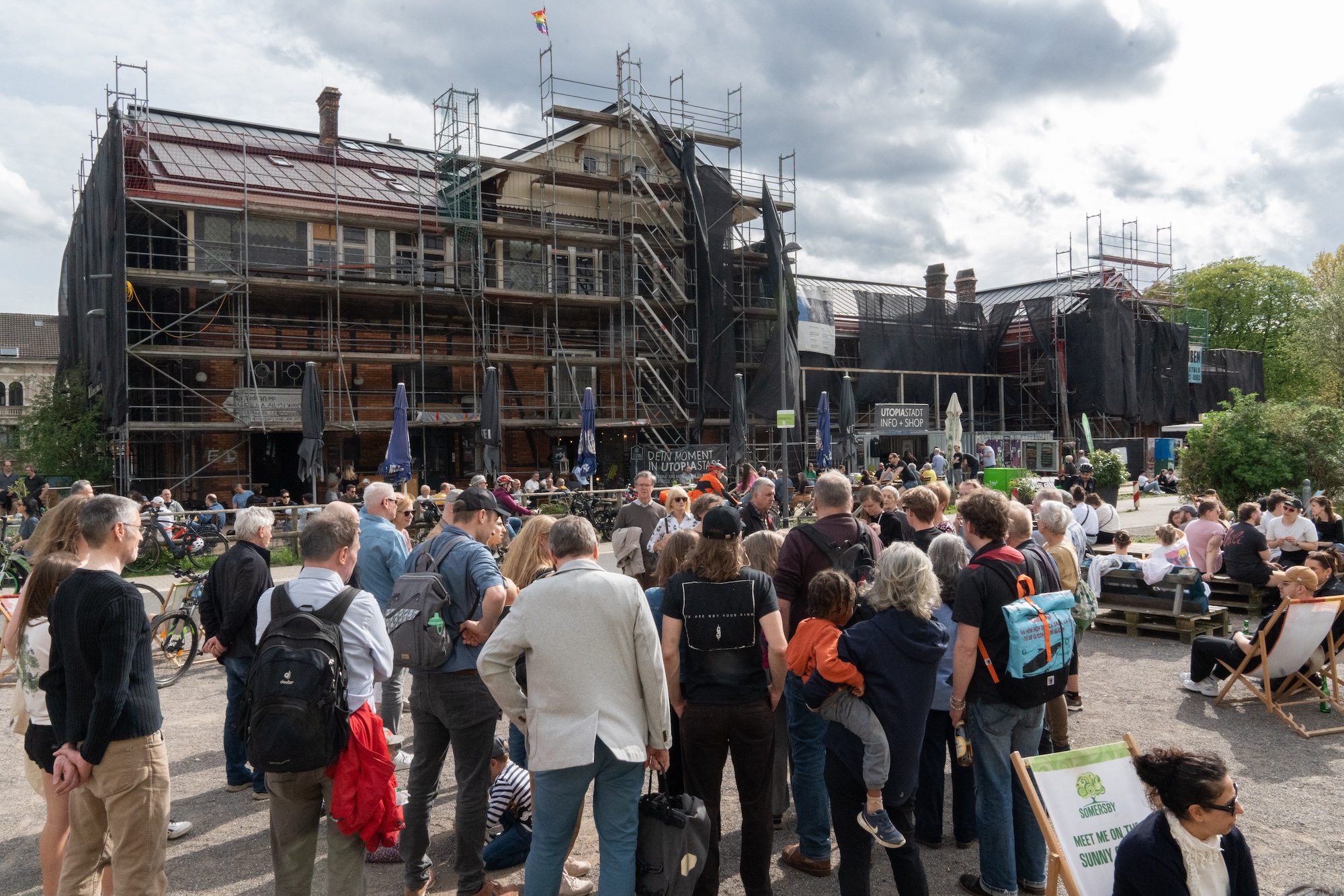 Das mürrische Wetter der bergischen Hauptstadt zeigt sich an diesem Sonntagnachmittag von seiner weniger rauen Seite. Der Himmel ist zwar mit grauen Wolken überzogen, doch die Sonne schafft es, klaffende Löcher in die Wolkendecke zu brechen und den Besucher*innen Utopiastadts eine gemütliche Atmosphäre zu bescheren. Es ist trubelig und an diesem Tag kommt jene Atmosphäre auf, die die Wuppertaler*innen in Utopiastadt so sehr schätzen. Jeglicher Gegenstand, der als Sitzgelegenheit zweckentfremdet werden kann, ist es. Es riecht nach Waffeln und aus der Boombox schallt Musik über die Freiflächen. Ich sitze mit Amanda Steinborn auf der Terrasse vor dem Hutmacher, während eine Gruppe von circa 40 Besucher*innen angeleitet von dem baukundigen Architekten und Vorstandsbeisitzenden Tobias Grosse-Brockhoff durch das historische Gemäuer geführt wird. Grund für das gemütliche Durcheinander ist vermutlich nicht allein das warme Wetter, sondern auch der „Tag der offenen Tür“, anlässlich dessen die Utopist*innen bereits zum dritten Mal ihre Türen öffnen.