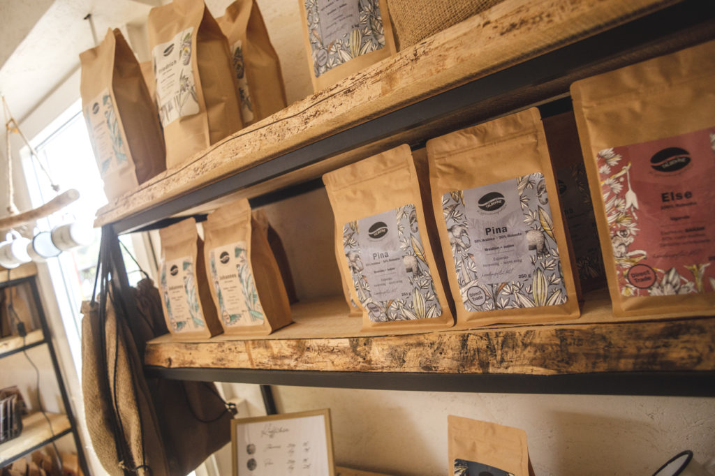 Sebastian verarbeitet deswegen nur fair gehandelte Kaffeebohnen die ohne Zwischenhändler*in direkt von den Kleinbäuer*innen erworben werden. Darin wird mit eingeschlossen, dass die Gelder für den Erwerb der Bohnen nicht nur an die Besitzer*innen der Anbaugebiete fließen, sondern ebenso an die Menschen die diese bestellen, versorgen und ernten. Außerdem werden direkt die Erzeugnisse ganzer Felder abgekauft, sodass die Existenzen der beteiligten Bäuer*innen garantiert gesichert sind. Aber auch in Sachen Nachhaltigkeit geht das Konzept Talbohne mit großen Schritten voran. Die von Ligarti designten Verpackungen bestehen zu 100% aus recyclebarem Rohstoffen und auch der Kaffeesatz wird nicht einfach in den Müll geschmissen. Stattdessen wird er entweder an die benachbarten Gärtner*innen des UtopiastadtGartens als Dünger oder an die Lebenshilfe weitergegeben. Letztere produziert aus den Kaffeeresten eine Kaffeeseife die z.B. im Conceptstore erworben werden kann. Des Weiteren produziert Yvonne aus den Kaffeesäcken, in denen die Bohnen geliefert werden, verschiedene Unikate, die im Conceptstore erwerben werden können – von Schlüsselanhängern bis hin zu Beuteln. Ganz im Sinne des Zusammenhalts und der lokalen Vernetzung streben Yvonne und Sebastian die Zusammenarbeit mit vielen verschiedenen Wuppertaler Akteur*innen an. Bisher arbeiten sie bereits mit der Lebenshilfe Wuppertal und Remscheid, der Tiermanufaktur Ligarti und einigen Cafés zusammen.