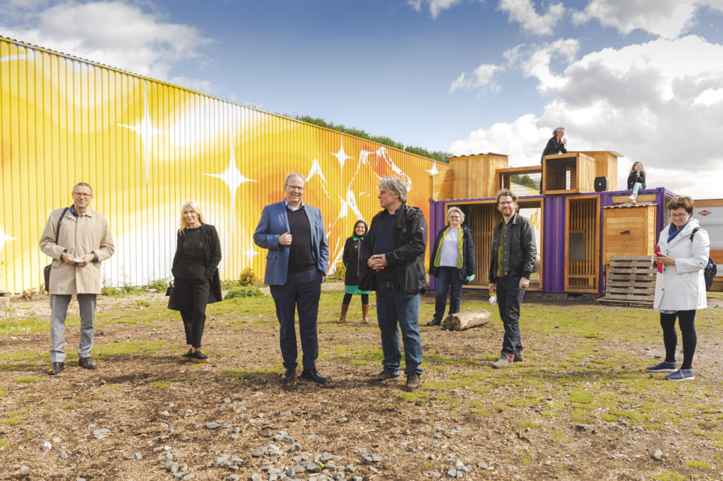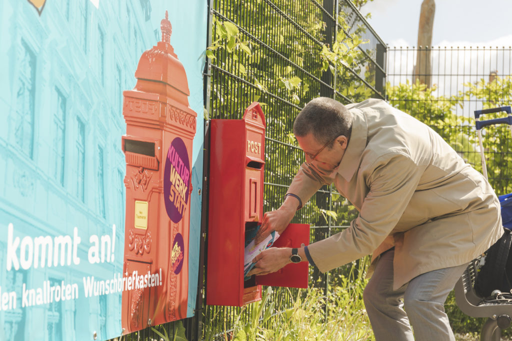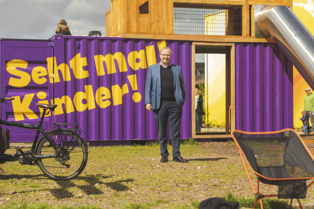 Anlässlich dieses Vorhabens, arbeitet die Kulturwerkstatt im Rahmen von „Mein Traumviertel“ mit verschiedenen Schulen und Kindergärten zusammen, die in Unterrichtseinheiten an Ideen arbeiten. Außerdem wurde an der Trassenseite des Kulturkindergartens ein Briefkasten installiert, in den Kinder und Jugendliche ihre Wünsche bzgl. ihres ganz eigenen Traumviertels einwerfen können. Diesen durfte der amtierende Oberbürgermeister Schneidewind im Zuge des Rundgangs leeren und dessen Inhalt betrachten. Alle Ergebnisse werden gesammelt und in einer Ausstellung am Ende des Jahres veröffentlicht. Allerdings wird sich diese Ausstellung nicht nur in Form von künstlerischen Darbietungen äußern, sondern darüber hinaus eine Bedarfsanalyse der Gegebenheiten aus Sicht der Kinder und Jugendlichen enthalten. Doch auch solche Projekte bedürfen finanzieller Mittel, um in einer Umsetzung zu enden. Die Firma „Knipex“ hat in den vergangenen Wochen sowohl die Kulturwerkstatt unterstützt als auch den Spielplatzcontainer finanziert. Letzterer steht seit knapp zwei Monaten auf dem Utopiastadt-Campus an der Nordbahntrasse. Doch hier soll er nicht auf ewig verweilen. Vielmehr ist es angedacht den Spielplatzcontainer durch das Stadtgebiet wandern zu lassen und damit Aufmerksamkeit für die Situation von Kindern und Jugendlichen in der Stadt zu schaffen. Aber warum engagiert sich eine globale Größe wie „Knipex“ für ein solches Vorhaben? Im Rahmen des Rundgangs mit Ralf Putsch, entgegnete er, dass die Missstände von Kindern und Jugendlichen allgegenwärtig seien. „Knipex“ habe die Ressourcen einen Teil dazu beizutragen, diesen Missständen entgegenzuwirken. Außerdem sei er der Auffassung, dass die Alte Feuerwache mit ihrer 30 jährigen Erfahrung ein wichtiger Akteur im Quartier sei, der unterstützungswürdige Arbeit leistet. Sowohl der Besuch des Briefkastens, als auch der des Spielplatzcontainers wurden von musikalischer Einlagen durch Kinder der blauen Gruppe des Kulturkindergartens und Jolina aus der Alten Feuerwache unter Anleitung von Björn Krüger begleitet.