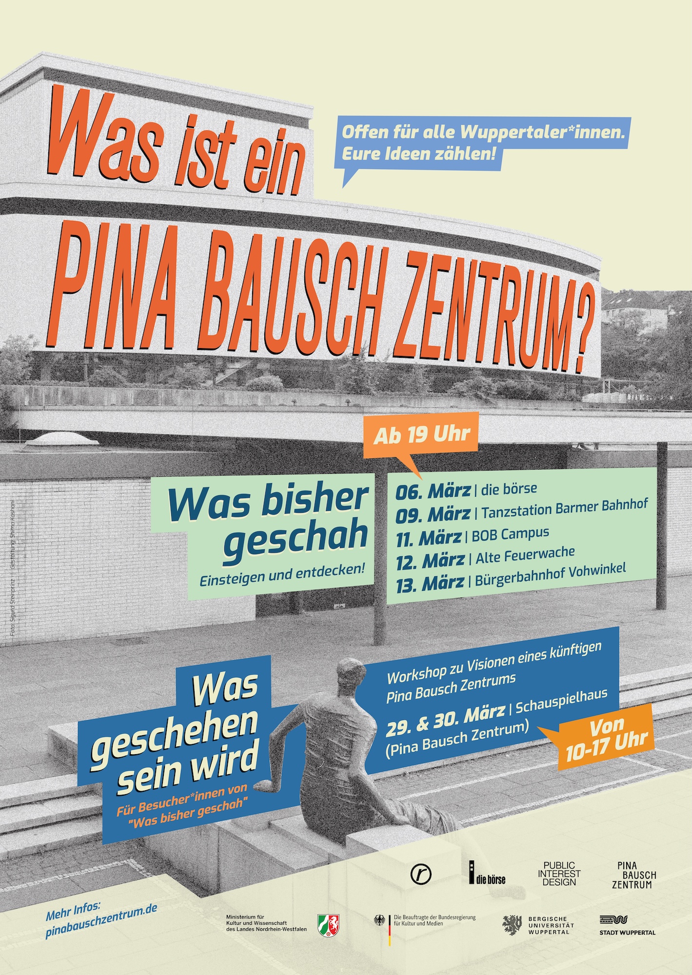 „Was ist ein Pina Bausch Zentrum?“ entsteht als Kooperation zwischen Wohnen in der Politik und dem Pina Bausch Zentrum „under construction“. Wohnen in der Politik ist eine Zusammenarbeit des Masterstudiengangs Public Interest Design der Bergischen Universität Wuppertal, des Regisseurs und Schauspielers Olaf Reitz und des Kommunikationszentrums die börse.