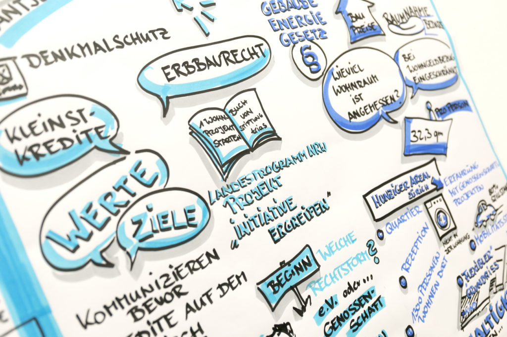 In vier Veranstaltungen führt das Mitmachprojekt Interessierte und Anwohner*innen an die mögliche Zukunft des Wohnens im Quartier Mirke heran. Dabei werden sowohl bereits existierende Alternativen aufgezeigt, wie auch das eigene Wohnverhalten analysiert und hinterfragt. Die Initiative Kreuzkirche stellte hierfür die Räumlichkeiten der Kreuzkirche im Herzen des Quartiers zur Verfügung. Auf der Auftaktveranstaltung stand ganz der Austausch über das eigene Wohnen samt aller Wünsche und Ambitionen im Vordergrund. Interessierte tauschten sich im Plenum über das eigenen Wohnen und Wohnverhalten aus und formulierten im Anschluss Wünsche und Hoffnungen für die Zukunft des Wohnens im urbanen Raum. Dabei stellt das Zusammenspiel der Auffassungen von Privatheit und Gemeinschaft, sowie der persönlichen Freiheit und Rücksicht eine große Rolle, die es zu beachten gilt. Alle essentiellen Aussagen und Wünsche wurden im Rahmen eines „graphic recordings“ für die Zukunft veranschaulicht und festgehalten.