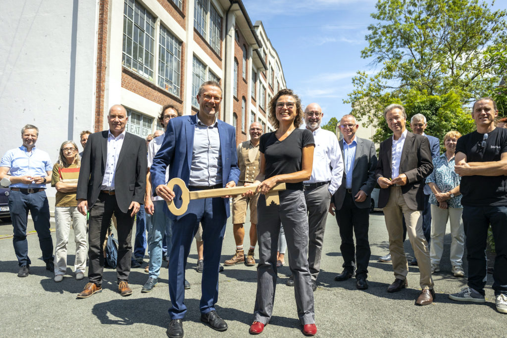 Die ehemalige Gold-Zack-Fabrik ist seit langer Zeit das Zuhause von diversen Projekten, die gemeinsam unter einem Dach koexistieren. Darunter z. B. das Bandwebermuseum, das TalTonTheater, das Fanprojekt Wuppertal, die Boulderhalle, das Café des Bahnhof Blo und Handwerksbetriebe. Doch als die Stadt 2019 bekannt gab, dass sie das Gold-Zack-Gebäude nicht mehr halten könne, begann die Zukunft zahlreicher Mieter*innen zu bröckeln. Zu oft hat der Verkauf von städtischen Gebäuden an die höchstbietende Person eine massive Steigerung der Mietpreise mit sich gezogen und somit das Ende bestehender Mietverhältnisse bedeutet. Das Forum:Mirke solidarisierte sich damals mit den Bestandsmieter*innen und gemeinsam forderten sie einen kontrollierten Verkaufsprozess. Das ehemalige Fabrikgebäude sollte auch zukünftig ein Raum bleiben, an dem vielfältige Akteur*innen gemeinsam unter einem Dach leben und gemeinsam einen Teil zur Entwicklung des Quartiers beitragen können – aber dafür brauchte es Kapital. Auf der Suche nach einer Lösung trafen die Beteiligten auf die „Montag Stiftung Urbane Räume“ , die bereits im Osten der Stadt den „BOB Campus“ [quartier-mirke.de] realisierte und ein ähnliches Anliegen wie die Mieter*innen verfolgte. Im Rahmen des 9. Stadtentwicklungssalons [quartier-mirke.de] lud das Forum:Mirke im November 2021 mit den Mieter*innen und der Stiftung ein, um gemeinsam mit Interessierten und anderen Akteur*innen über die Zukunft des Gebäudes zu sprechen. Nach wirtschaftlicher und baulicher Planung und Verhandlungen mit der Stadt Wuppertal und den Mieter*innen wurde am 14. Juli 2022 dann schlussendlich der symbolische Schlüssel durch den Oberbürgermeister übergeben. Neben der KoFabrik in Bochum, der Nachbarschaft Samtweberei in Krefeld, dem Bürgerpark FreiFeld in Halle an der Saale, dem HonsWerk in Remscheid und dem BOB Campus in Wuppertal Oberbarmen wird seitdem ein weiteres Projekt unter den gleichen Leitzielen von der Stiftung entwickelt: die Wiesenwerke im Mirker Quartier.