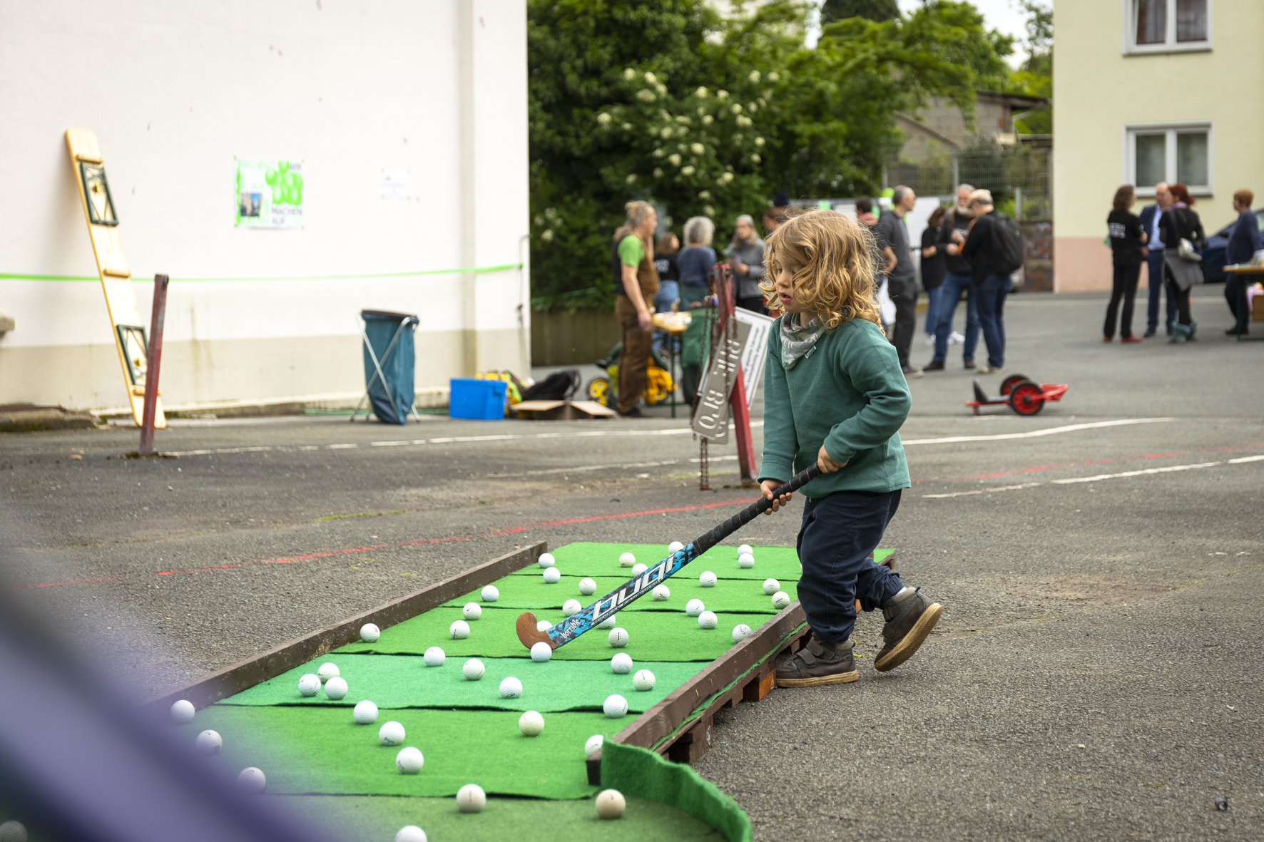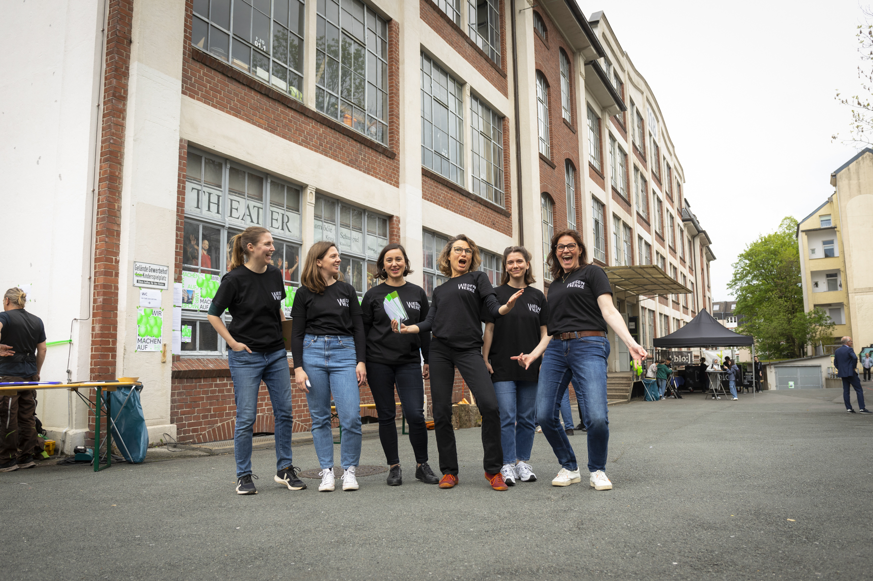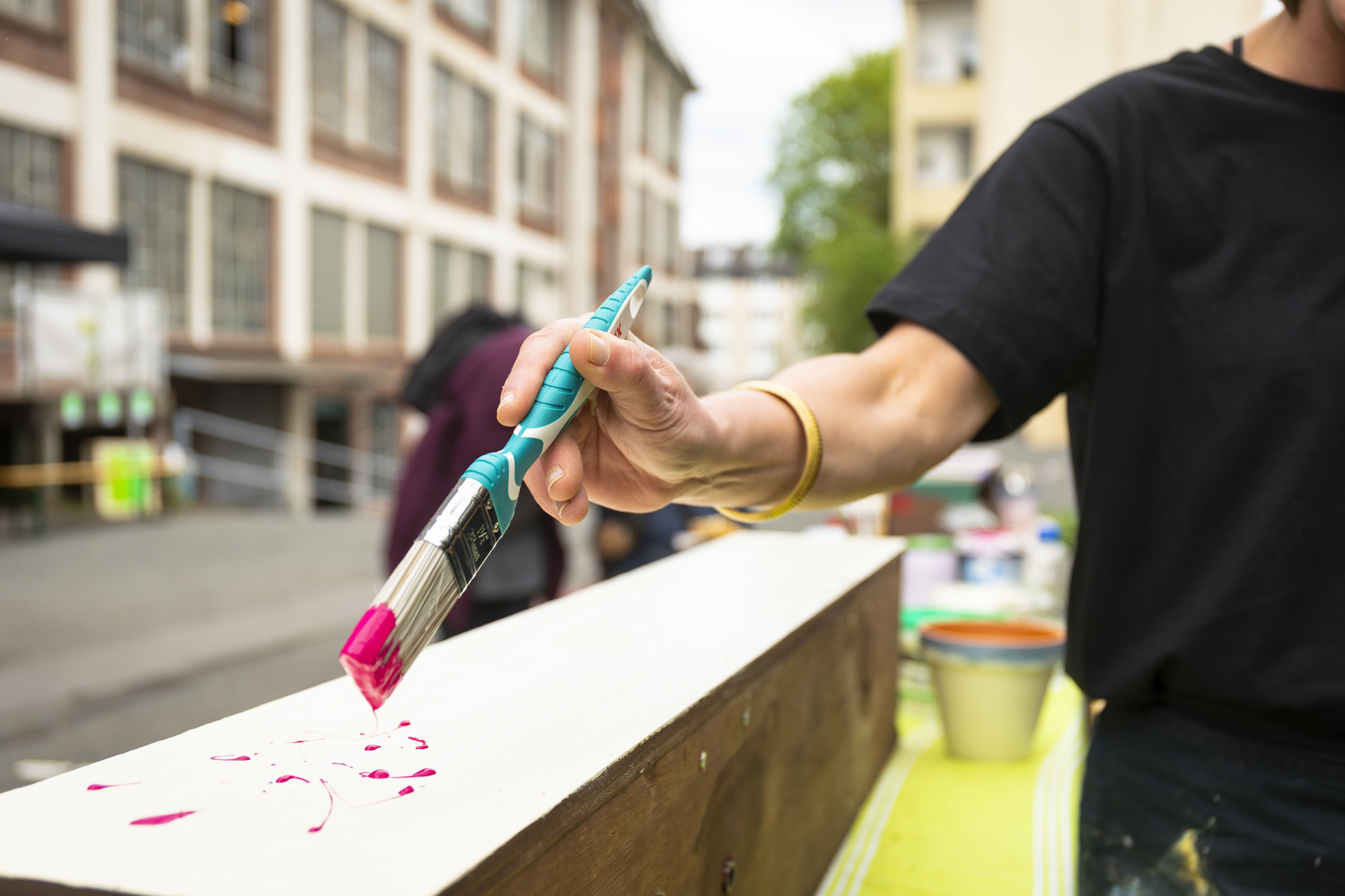 Wie das in Zukunft aussehen könnte, offenbaren die WiesenWerke schon durch eine symbolische Lücke im Zaun zur Wiesenstraße. Entlang des Zaunes soll durch den Wegfall einzelner Parkplätze zukünftig eine Quartiersfläche entstehen, die gemeinsam mit den Nachbar*innen geplant und mithilfe von Mitteln der Städtebauförderung finanziert werden soll. An diesem Tage wurden bereits erste Gestaltungsideen für die umliegenden Grünflächen, einen geplanten Weg zur Nordbahntrasse und die Quartiersfläche gesammelt und somit Anreize für Gespräche geschaffen werden, die sich trotz des Regenschauers nicht aufhielten ließen. Auch die kleinen Bewohner*innen des Quartiers gingen nicht leer aus. Neben dem umfangreichen Fuhrpark des Fanprojekts Wuppertal, konnte Tischtennis-Rundlauf und Supagolf gespielt, einzelne Ausstellungsstücke des Bandwebermuseums angeschaut und angefasst, und Blumentöpfe bemalt werden, die auf der zukünftigen Quartiersfläche aufgestellt werden sollen. Das Team des Bahnhof Blo sorgte im Innenraum und auf den Außenflächen währenddessen für das leibliche Wohl und schaffte eine Atmosphäre, in der die Quartiersbewohner*innen sich niederlassen und das bunte Treiben genießen konnten. Apropos Innen und Außen: Geschäftsführerin Silvia Harth bot drei Führungen durch die WiesenWerke an, im Rahmen derer Interessierte Fragen stellen konnten, Einblick in die Planung erhielten und bereits erste sanierte Räumlichkeiten begutachten durften. Weitere Informationen zu den WiesenWerken erhältst du hier [HOMEPAGE Q:M].