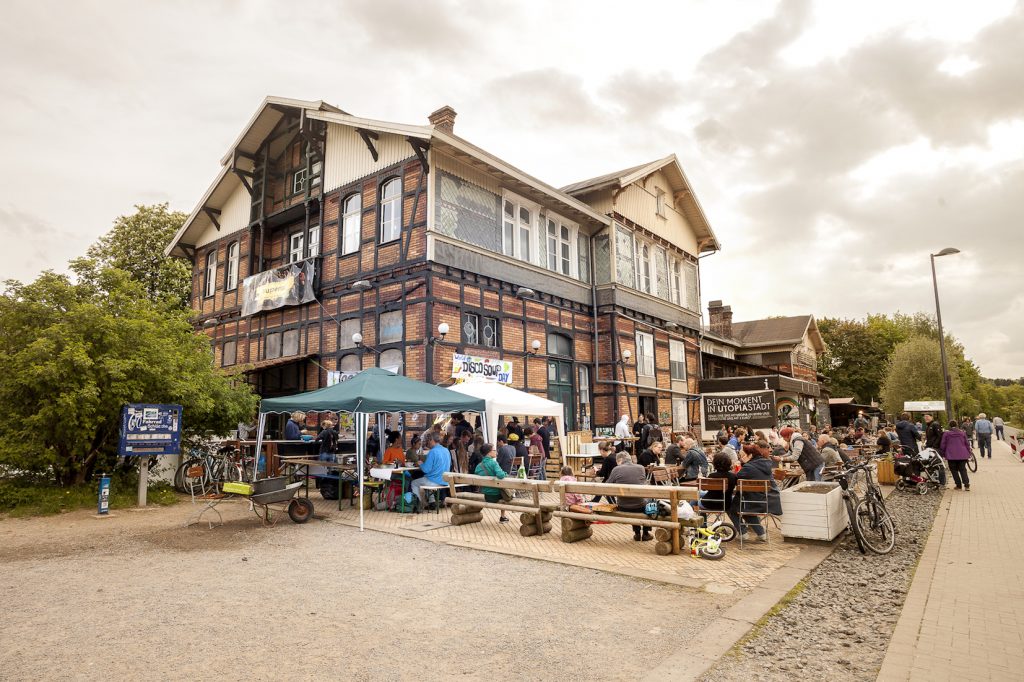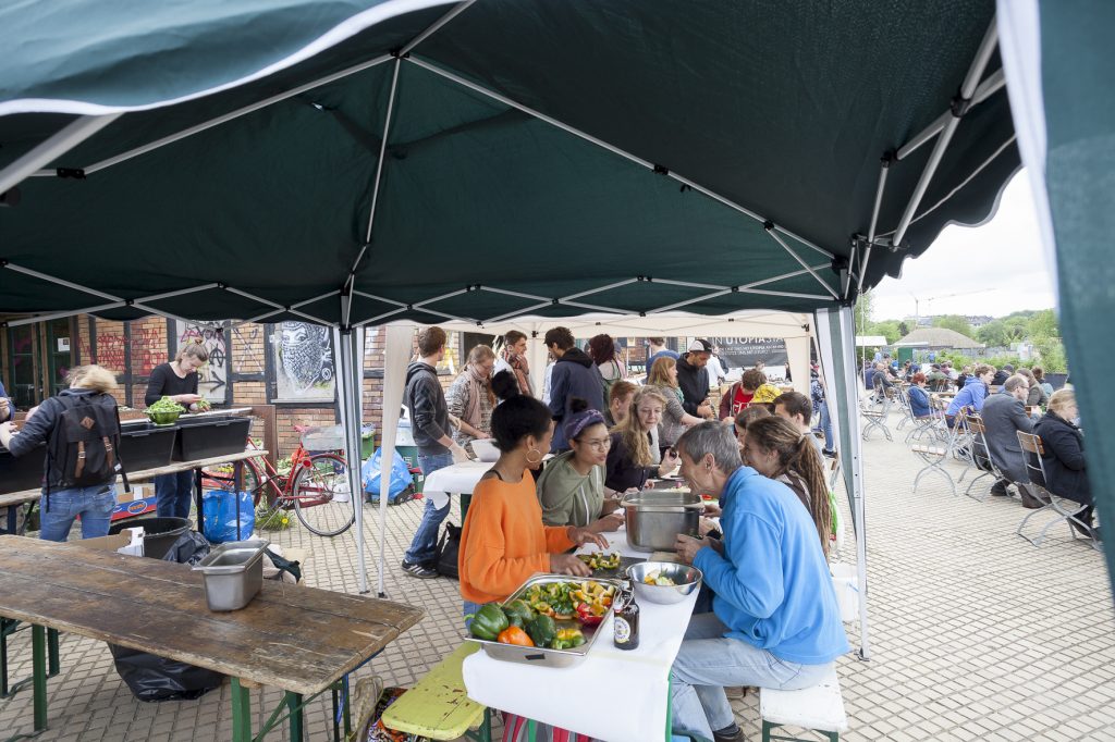 Gemeinsam wurde Utopiastadt an diesem Tag zu einem Raum der Begegnung, der etwas anderen Art. Zwischen dem Zerschnibbeln von allerlei Gemüsesorten blieb außerordentlich viel Platz für Begegnung jeglicher Art. Es wurde gemeinsam gelacht, diskutiert, gekocht, getanzt und natürlich gegessen! Die Zutaten wurden vom »Foodsharing Wuppertal« aus verschiedensten Läden der Stadt bereitgestellt und somit vor dem verschwendeten Gang in die Tonne gerettet!